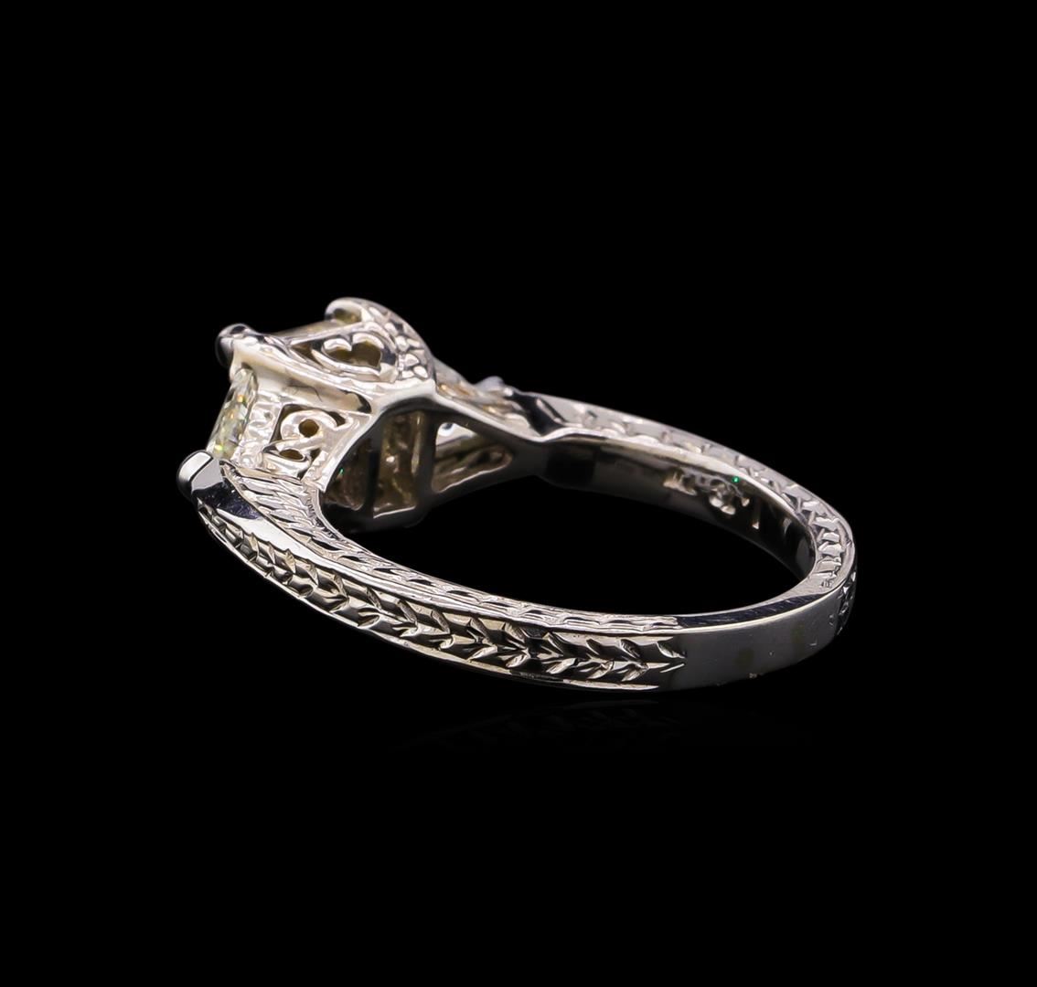 One electronically tested 14KT white gold lady's cast wedding ring with a cathedral shank with a bright polish, hand-engraved detail finish. Condition is new, good workmanship. The featured lady's ring has a shank measuring 2.26 millimeters wide. Identified with markings of 14K. Containing: One prong set princess cut diamond, measuring 6.18 x 5.51 x 4.29 mm (depth est.) approximate weight of 1.21ct. Clarity enhanced. Graded loose prior to the setting, EGL USA laser inscribed Report #US 908460205D. Clarity: SI-3; Color: J-K; Cut: Very Good. Two prong set triangle cut diamonds, measuring 4.40 x 4.30 x 2.67mm (depth est.) approximate total weight of 2 Stones = 0.57ct. Graded in the setting. Clarity: SI-1; Color: I-J; Cut: Very Good. Total Weight of Diamonds: 1.78 ct. Total Weight of Ring: 4.50gm. GAS Appraised at $6,790.00.