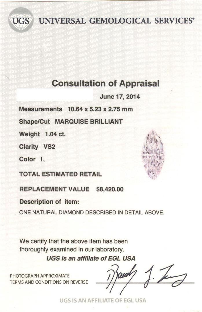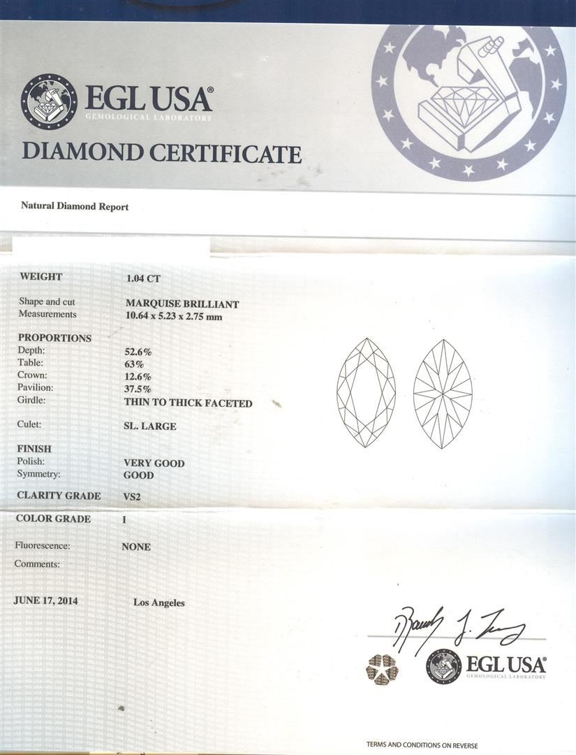One electronically tested 18KT white gold lady's combination cast & assembled wedding ring with a tapered cathedral shank with a bright polish with milgrain detailing finish. The featured lady's ring has a shank measuring 2.54 millimeters wide. Identified with markings of "18K". Condition is new, good workmanship. Containing: One prong set marquise shaped cut diamond, measuring 10.64 x 5.23 x 2.75mm (depth est.) , 10.00.%. GTCF approximate weight of 1.04ct. EGL USA Laboratory Report #911339902. Clarity: VS-2. Color: I. Cut Good Twenty-Two prong set round brilliant cut diamonds, measuring 1.80 - 1.70 x 1.09mm (depth est.) approximate total weight of 22 Stones = 0.45ct. Graded in the setting. Clarity: SI-1 to SI-2. Color: G - I. Cut Good Fifty prong set round brilliant cut diamonds, measuring 1.30 - 1.10 x 0.74mm (depth est.) approximate total weight of 50 Stones = 0.33ct. Graded in the setting. Clarity: SI-1 to SI-2. Color: G - Good. Total Weight of Diamonds 1.82ct. Total Weight of Ring 5.00gm. GAS Appraised at $14,620.00.