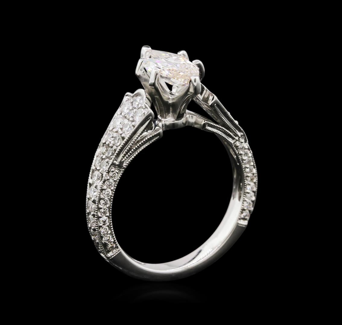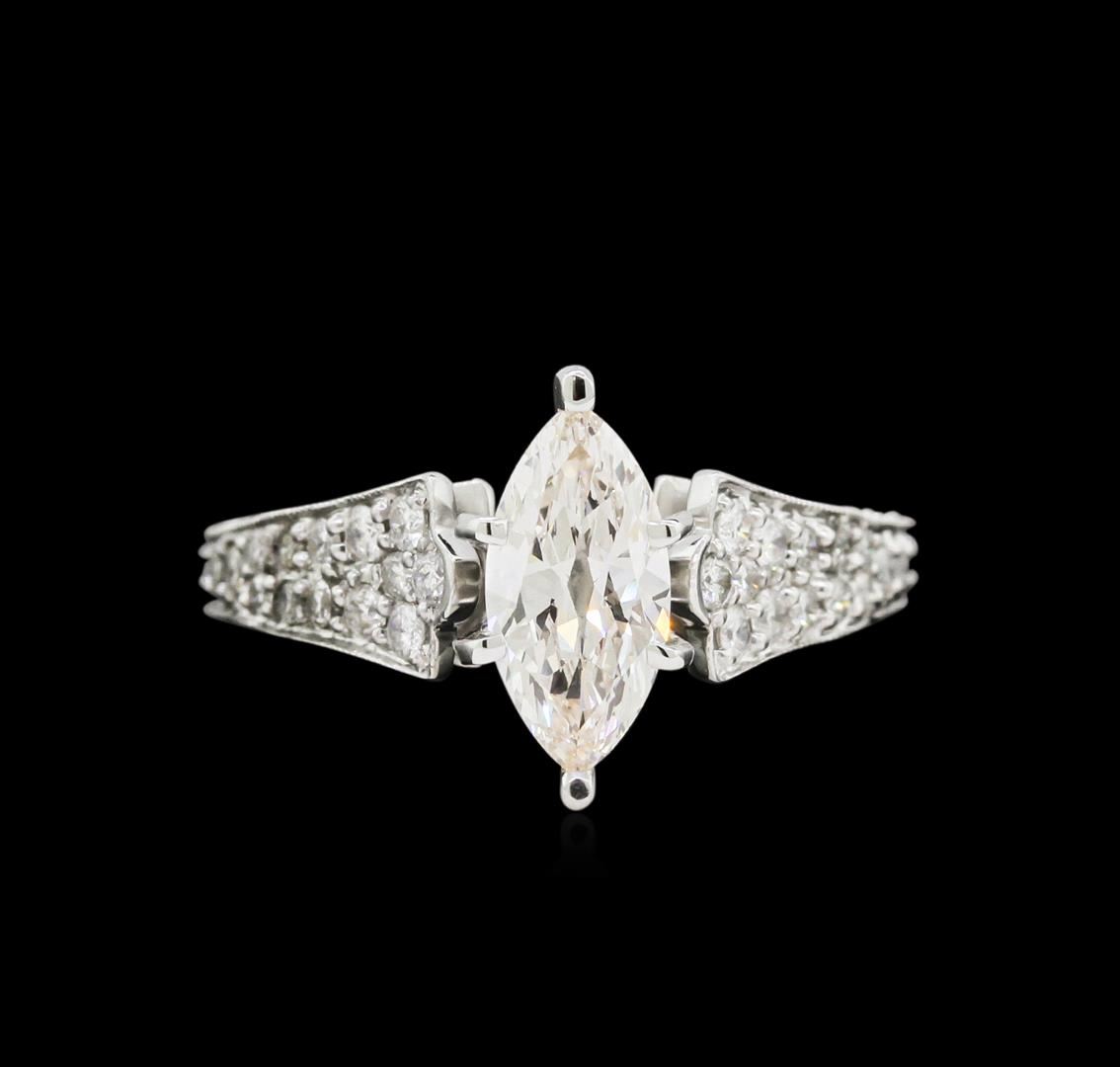 One electronically tested 18KT white gold lady's combination cast & assembled wedding ring with a tapered cathedral shank with a bright polish with milgrain detailing finish. The featured lady's ring has a shank measuring 2.54 millimeters wide. Identified with markings of "18K". Condition is new, good workmanship. Containing: One prong set marquise shaped cut diamond, measuring 10.64 x 5.23 x 2.75mm (depth est.) , 10.00.%. GTCF approximate weight of 1.04ct. EGL USA Laboratory Report #911339902. Clarity: VS-2. Color: I. Cut Good Twenty-Two prong set round brilliant cut diamonds, measuring 1.80 - 1.70 x 1.09mm (depth est.) approximate total weight of 22 Stones = 0.45ct. Graded in the setting. Clarity: SI-1 to SI-2. Color: G - I. Cut Good Fifty prong set round brilliant cut diamonds, measuring 1.30 - 1.10 x 0.74mm (depth est.) approximate total weight of 50 Stones = 0.33ct. Graded in the setting. Clarity: SI-1 to SI-2. Color: G - Good. Total Weight of Diamonds 1.82ct. Total Weight of Ring 5.00gm. GAS Appraised at $14,620.00.