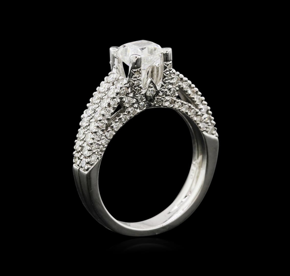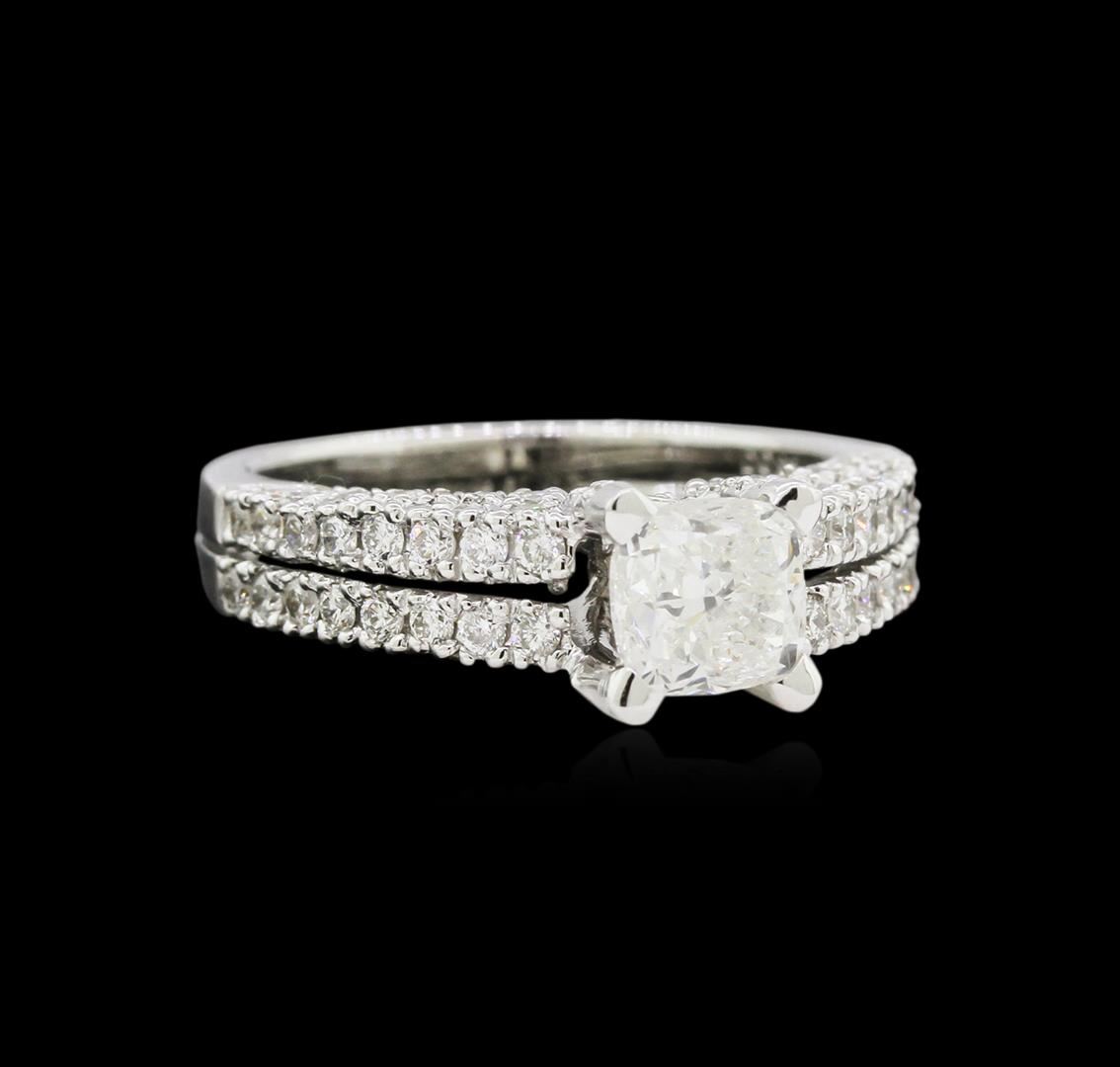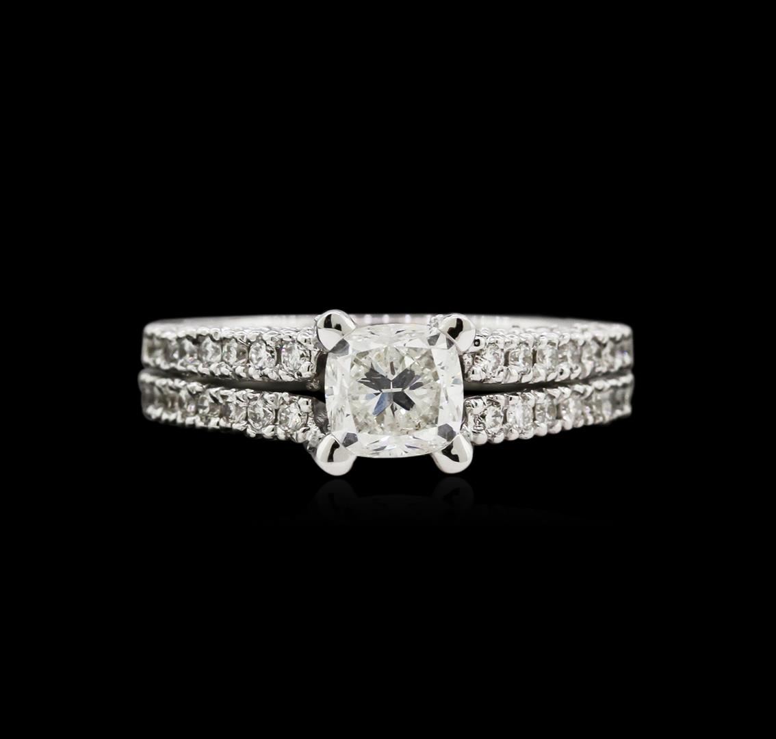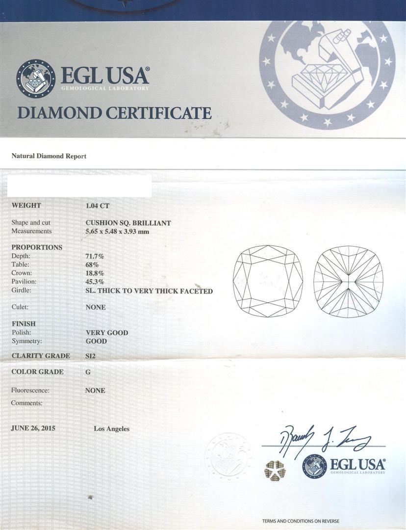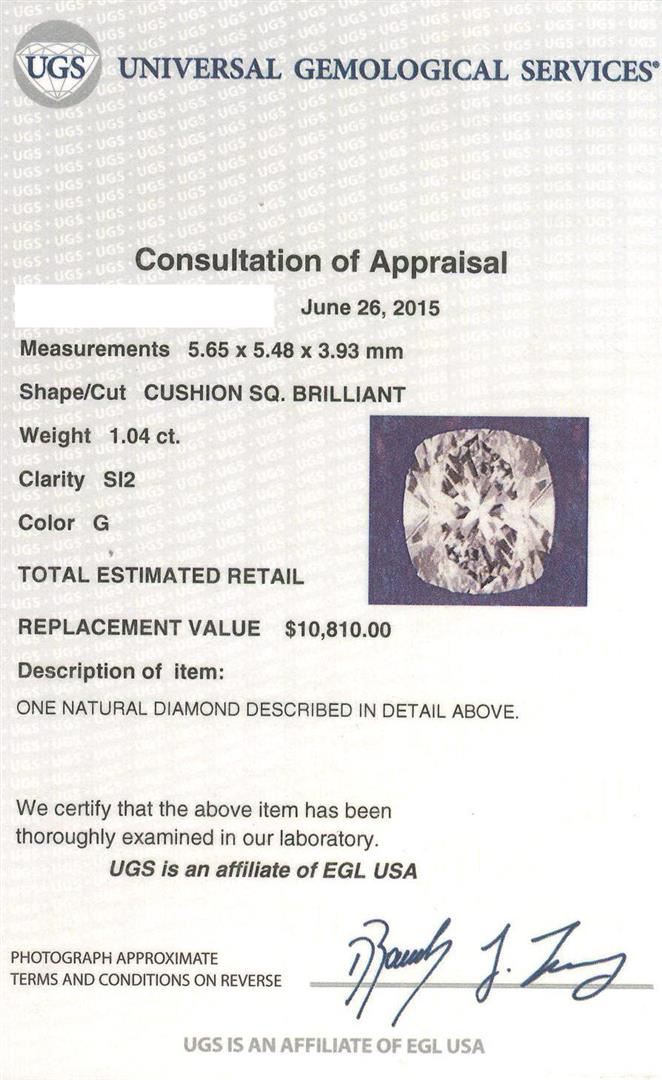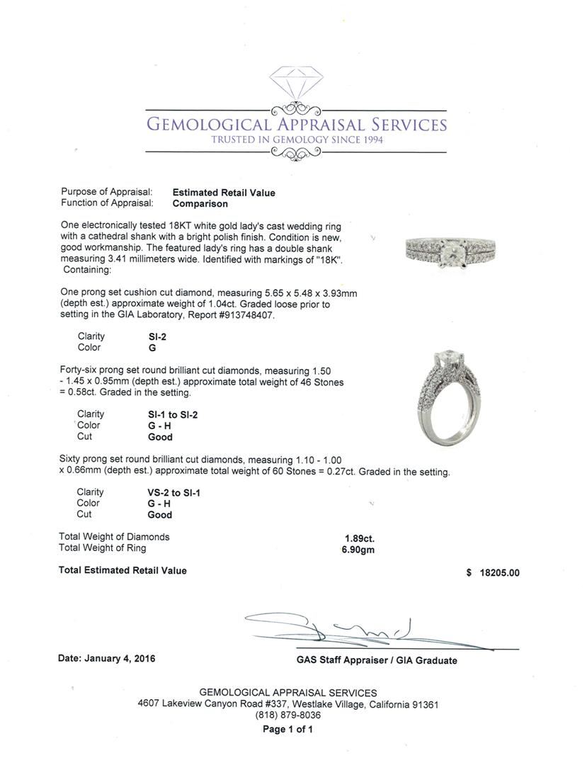 One electronically tested 18KT white gold lady's cast wedding ring with a cathedral shank with a bright polish finish. The featured lady's ring has a double shank measuring 3.41 millimeters wide. Identified with markings of "18K". Condition is new, good workmanship. Containing: One prong set cushion cut diamond, measuring 5.65 x 5.48 x 3.93mm (depth est.) approximate weight of 1.04ct. Graded loose prior to setting in the GIA Laboratory, Report #913748407. Clarity: SI-2. Color: G Forty-Six prong set round brilliant cut diamonds, measuring 1.50 - 1.45 x 0.95mm (depth est.) approximate total weight of 46 Stones = 0.58ct. Graded in the setting. Clarity: SI-1 to SI-2. Color: G - Good Sixty prong set round brilliant cut diamonds, measuring 1.10 - 1.00 x 0.66mm (depth est.) approximate total weight of 60 Stones = 0.27ct. Graded in the setting. Clarity: VS-2 to SI-1. Color: G - Good. Total Weight of Diamonds 1.89ct. Total Weight of Ring 6.90gm. GAS Appraised at $18,205.00.