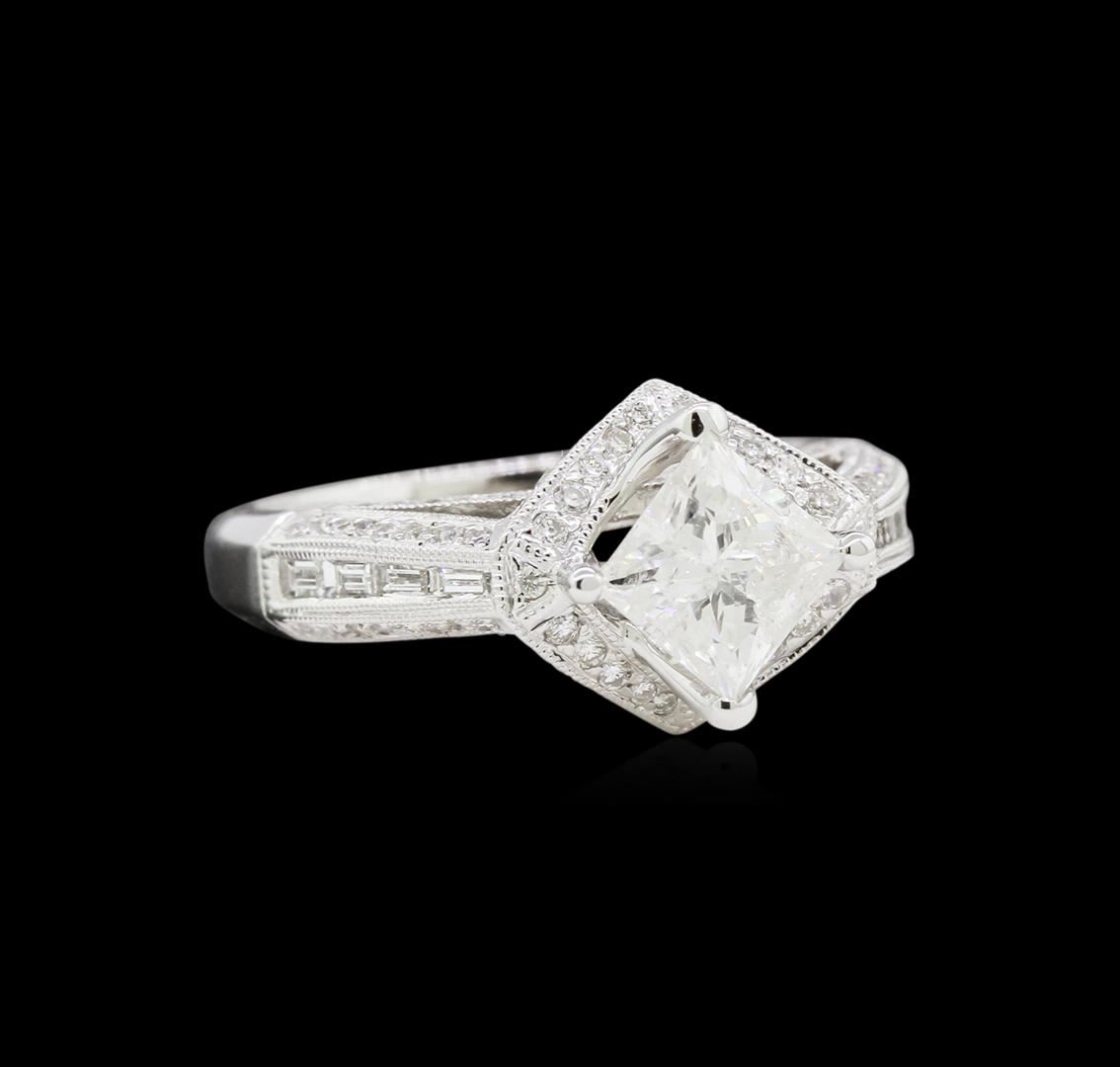 One electronically tested 18KT white gold lady's cast wedding ring with a cathedral shank with a bright polish with milgrain detailing finish. The featured lady's ring has a shank measuring 2.95 millimeters wide. Identified with markings of "18K 750". Condition is new, good workmanship. Containing: One prong set princess cut diamond, measuring 5.86 x 5.71 x 4.28mm (depth est.) approximate weight of 1.16ct. EGL USA Laboratory Report #911386315. Clarity: I-1. Color: Very Good Eight channel set baguette cut diamonds, measuring from 2.30 x 1.00 x 0.85mm (depth est.) to 2.50 x 1.20 x 1.02mm (depth est.) approximate total weight of 8 Stones = 0.22ct. Graded in the setting. Clarity: VS-1 to VS-2. Color: G - Good One Hundred Eight prong set round brilliant cut diamonds, measuring 1.20 - 1.00 x 0.69mm (depth est.) approximate total weight of 108 Stones = 0.54ct. Graded in the setting. Clarity: SI-1 to SI-2. Color: G - Very Good. Total Weight of Diamonds 1.92ct. Total Weight of Ring 6.40gm. GAS Appraised at $10,990.00.