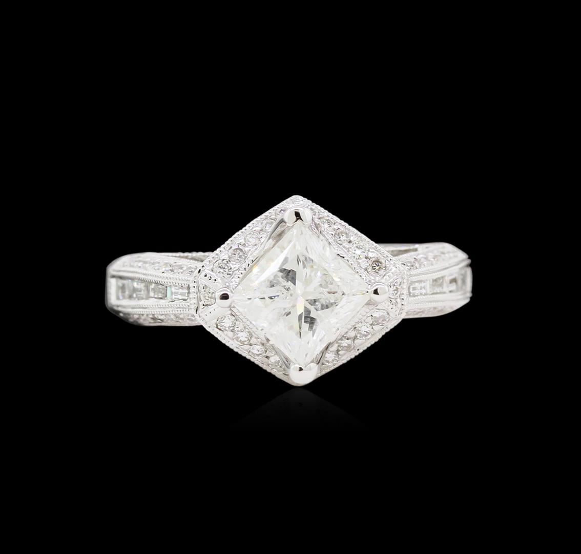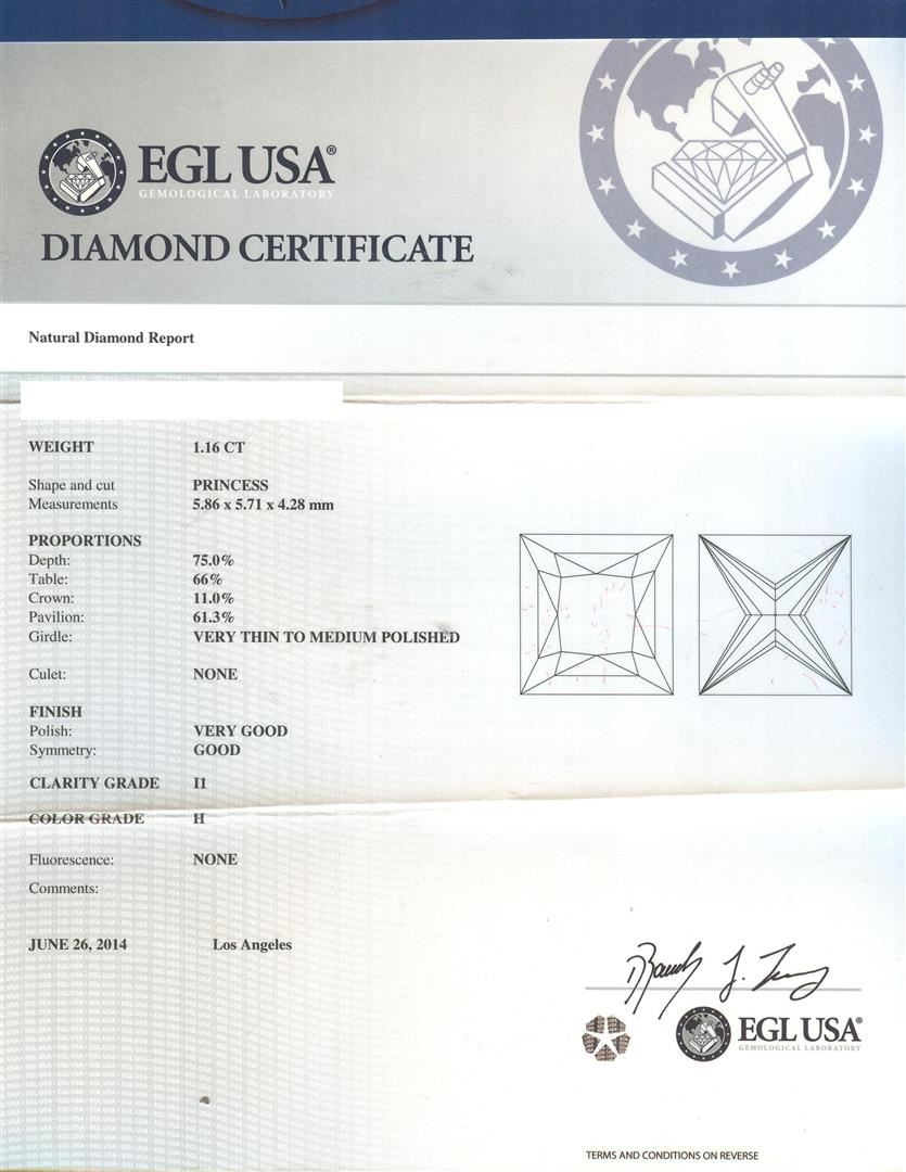 One electronically tested 18KT white gold lady's cast wedding ring with a cathedral shank with a bright polish with milgrain detailing finish. The featured lady's ring has a shank measuring 2.95 millimeters wide. Identified with markings of "18K 750". Condition is new, good workmanship. Containing: One prong set princess cut diamond, measuring 5.86 x 5.71 x 4.28mm (depth est.) approximate weight of 1.16ct. EGL USA Laboratory Report #911386315. Clarity: I-1. Color: Very Good Eight channel set baguette cut diamonds, measuring from 2.30 x 1.00 x 0.85mm (depth est.) to 2.50 x 1.20 x 1.02mm (depth est.) approximate total weight of 8 Stones = 0.22ct. Graded in the setting. Clarity: VS-1 to VS-2. Color: G - Good One Hundred Eight prong set round brilliant cut diamonds, measuring 1.20 - 1.00 x 0.69mm (depth est.) approximate total weight of 108 Stones = 0.54ct. Graded in the setting. Clarity: SI-1 to SI-2. Color: G - Very Good. Total Weight of Diamonds 1.92ct. Total Weight of Ring 6.40gm. GAS Appraised at $10,990.00.
