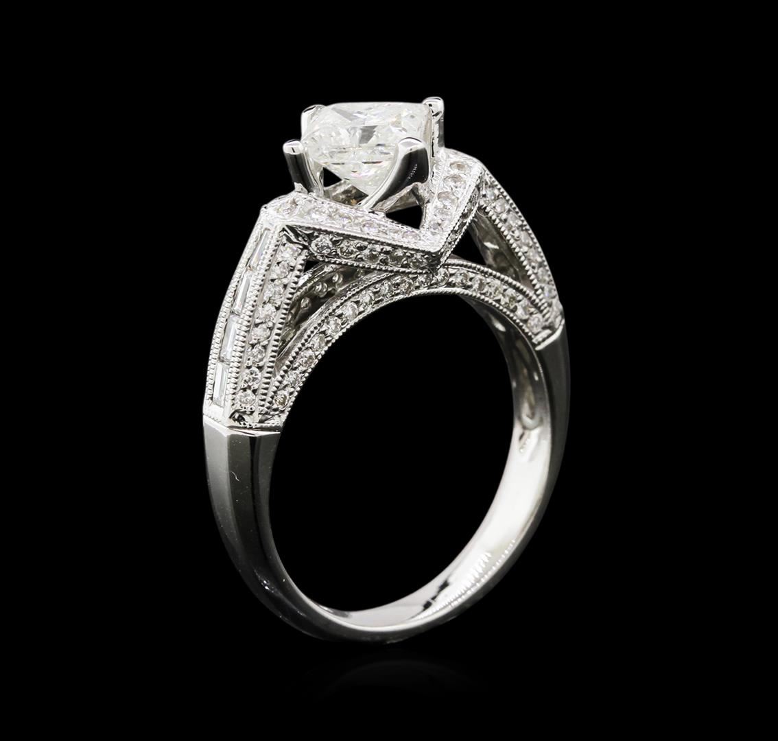 One electronically tested 18KT white gold lady's cast wedding ring with a cathedral shank with a bright polish with milgrain detailing finish. The featured lady's ring has a shank measuring 2.95 millimeters wide. Identified with markings of "18K 750". Condition is new, good workmanship. Containing: One prong set princess cut diamond, measuring 5.86 x 5.71 x 4.28mm (depth est.) approximate weight of 1.16ct. EGL USA Laboratory Report #911386315. Clarity: I-1. Color: Very Good Eight channel set baguette cut diamonds, measuring from 2.30 x 1.00 x 0.85mm (depth est.) to 2.50 x 1.20 x 1.02mm (depth est.) approximate total weight of 8 Stones = 0.22ct. Graded in the setting. Clarity: VS-1 to VS-2. Color: G - Good One Hundred Eight prong set round brilliant cut diamonds, measuring 1.20 - 1.00 x 0.69mm (depth est.) approximate total weight of 108 Stones = 0.54ct. Graded in the setting. Clarity: SI-1 to SI-2. Color: G - Very Good. Total Weight of Diamonds 1.92ct. Total Weight of Ring 6.40gm. GAS Appraised at $10,990.00.