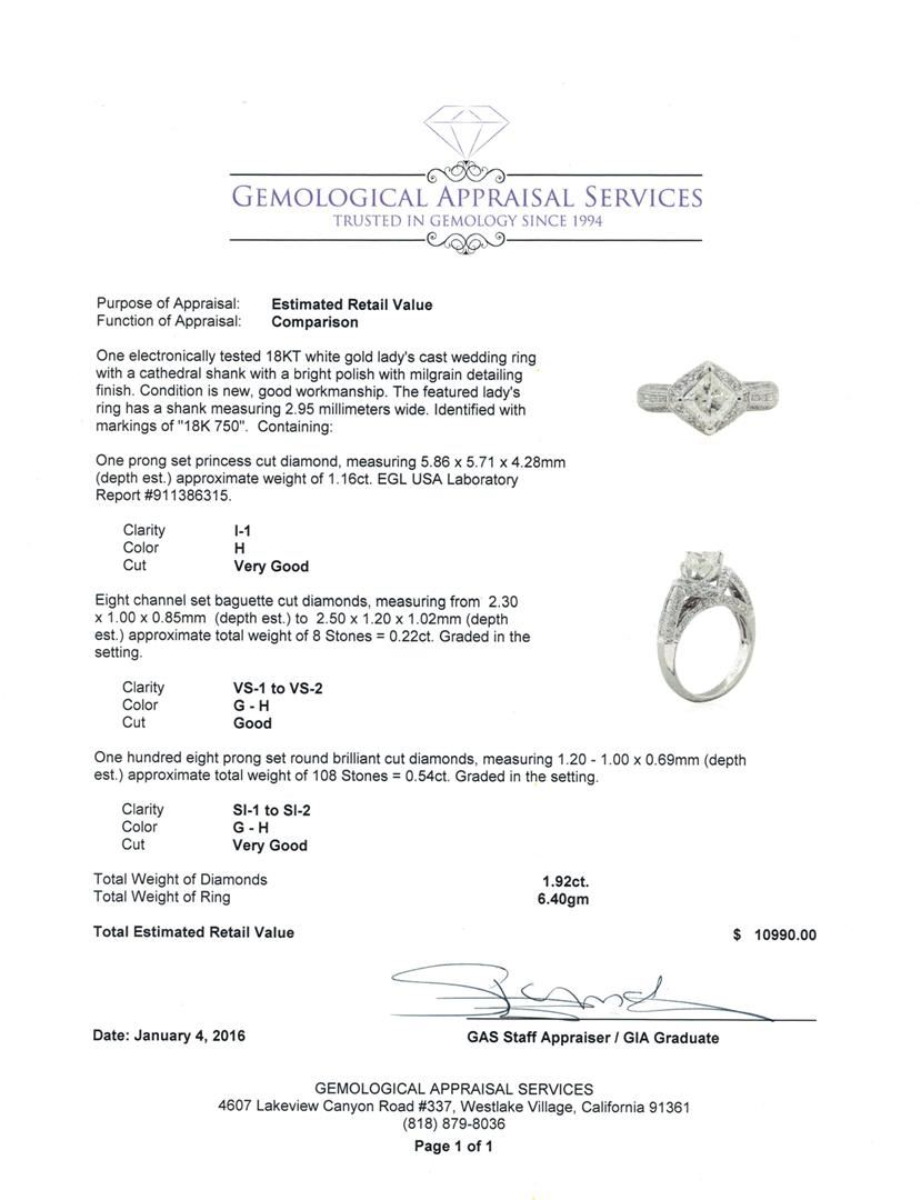 One electronically tested 18KT white gold lady's cast wedding ring with a cathedral shank with a bright polish with milgrain detailing finish. The featured lady's ring has a shank measuring 2.95 millimeters wide. Identified with markings of "18K 750". Condition is new, good workmanship. Containing: One prong set princess cut diamond, measuring 5.86 x 5.71 x 4.28mm (depth est.) approximate weight of 1.16ct. EGL USA Laboratory Report #911386315. Clarity: I-1. Color: Very Good Eight channel set baguette cut diamonds, measuring from 2.30 x 1.00 x 0.85mm (depth est.) to 2.50 x 1.20 x 1.02mm (depth est.) approximate total weight of 8 Stones = 0.22ct. Graded in the setting. Clarity: VS-1 to VS-2. Color: G - Good One Hundred Eight prong set round brilliant cut diamonds, measuring 1.20 - 1.00 x 0.69mm (depth est.) approximate total weight of 108 Stones = 0.54ct. Graded in the setting. Clarity: SI-1 to SI-2. Color: G - Very Good. Total Weight of Diamonds 1.92ct. Total Weight of Ring 6.40gm. GAS Appraised at $10,990.00.