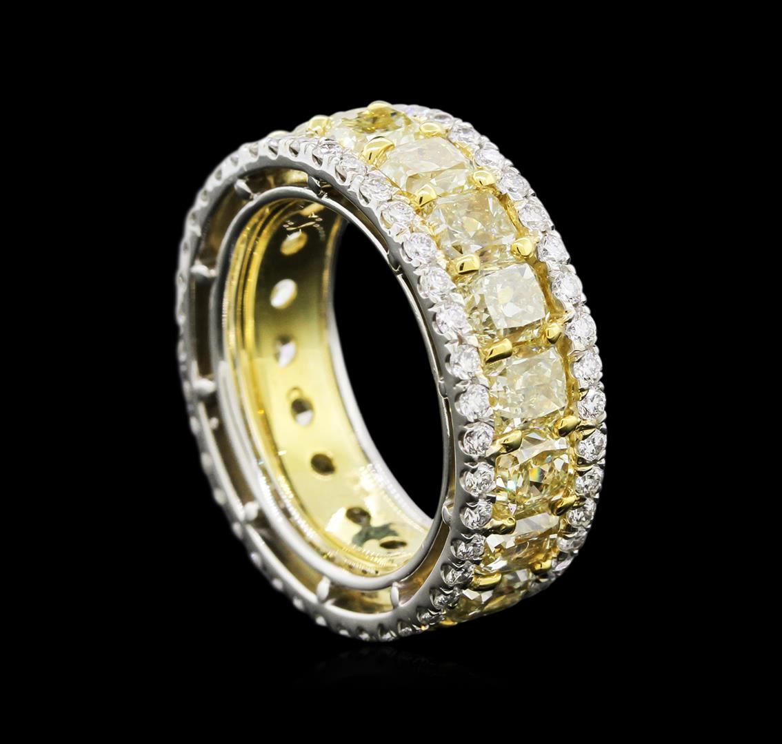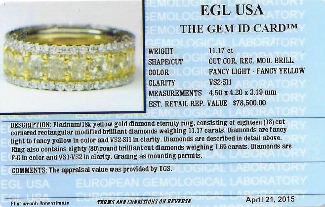 One EGL USA Certified platinum and 18KT yellow gold diamond eternity ring, consisting of eighteen (18) cut cornered rectangular modified brilliant diamonds weighing 11.17 carats. Color: Fancy Light - Fancy Yellow. Clarity: VS2-SI1. Measurements: 4.50 x 4.20 x 3.19mm. Ring also contains eighty (80) round brilliant cut diamonds weighing 1.65 carats. Diamonds are F-G in color and VS1-VS2 in clarity. Total Weight of Ring: 14.10 grams. UGS Appraised at $78,500.00.