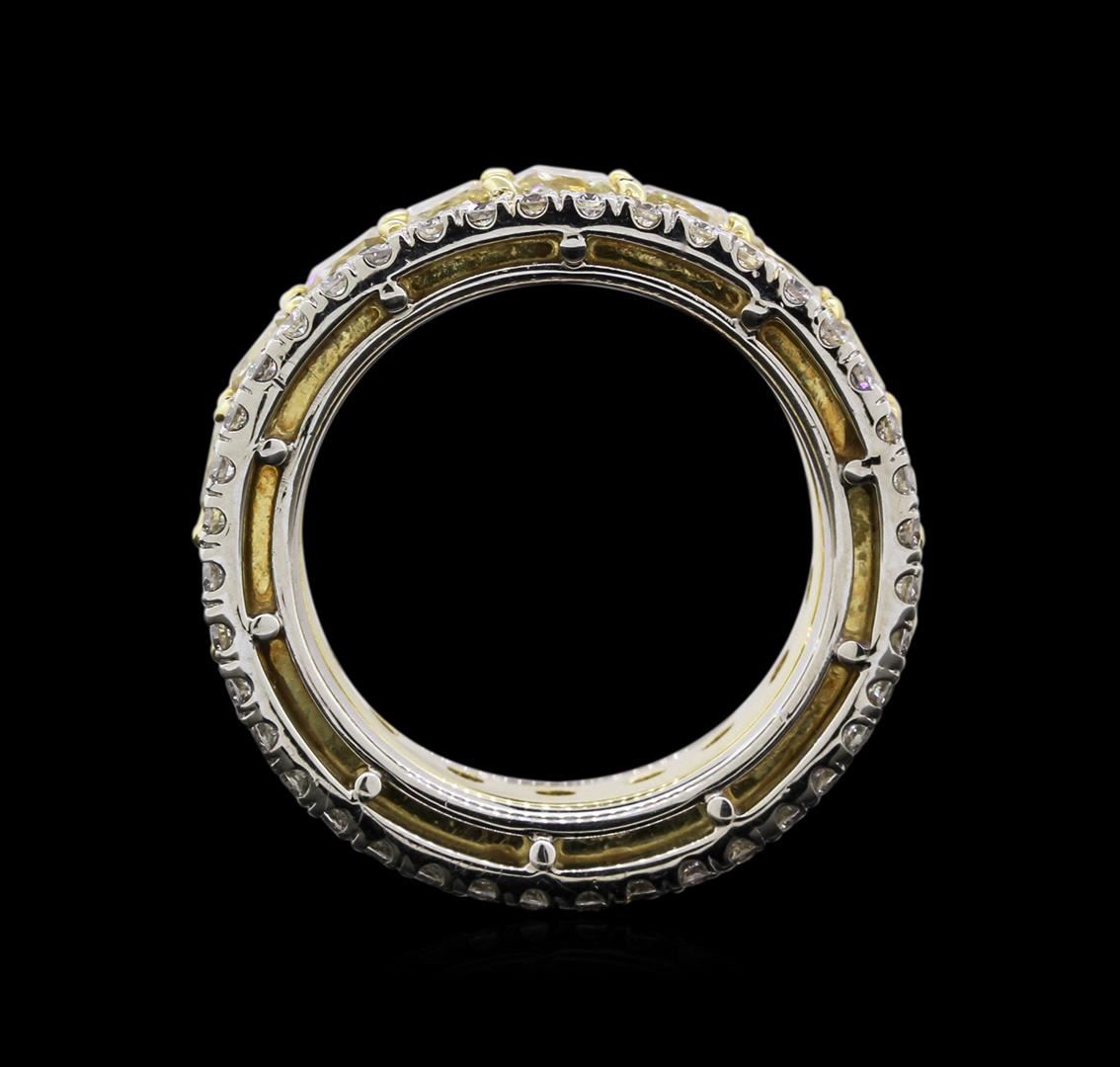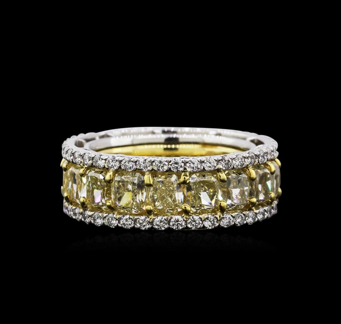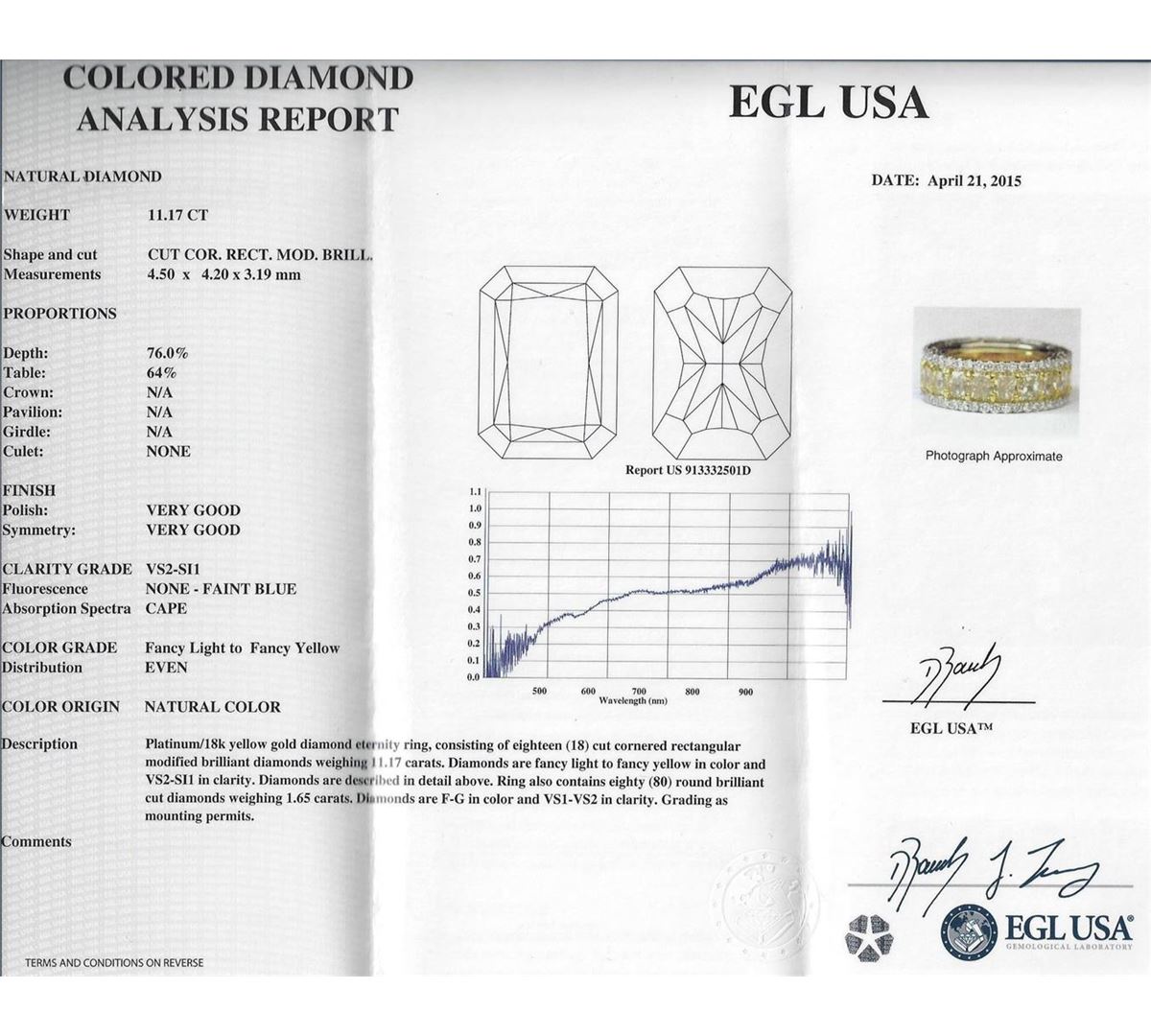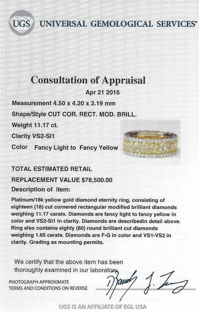 One EGL USA Certified platinum and 18KT yellow gold diamond eternity ring, consisting of eighteen (18) cut cornered rectangular modified brilliant diamonds weighing 11.17 carats. Color: Fancy Light - Fancy Yellow. Clarity: VS2-SI1. Measurements: 4.50 x 4.20 x 3.19mm. Ring also contains eighty (80) round brilliant cut diamonds weighing 1.65 carats. Diamonds are F-G in color and VS1-VS2 in clarity. Total Weight of Ring: 14.10 grams. UGS Appraised at $78,500.00.