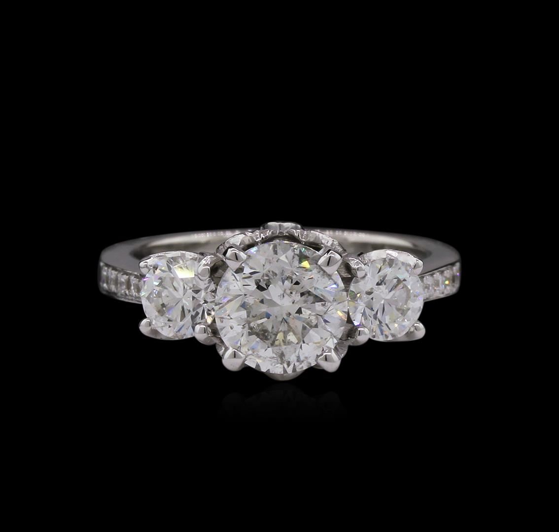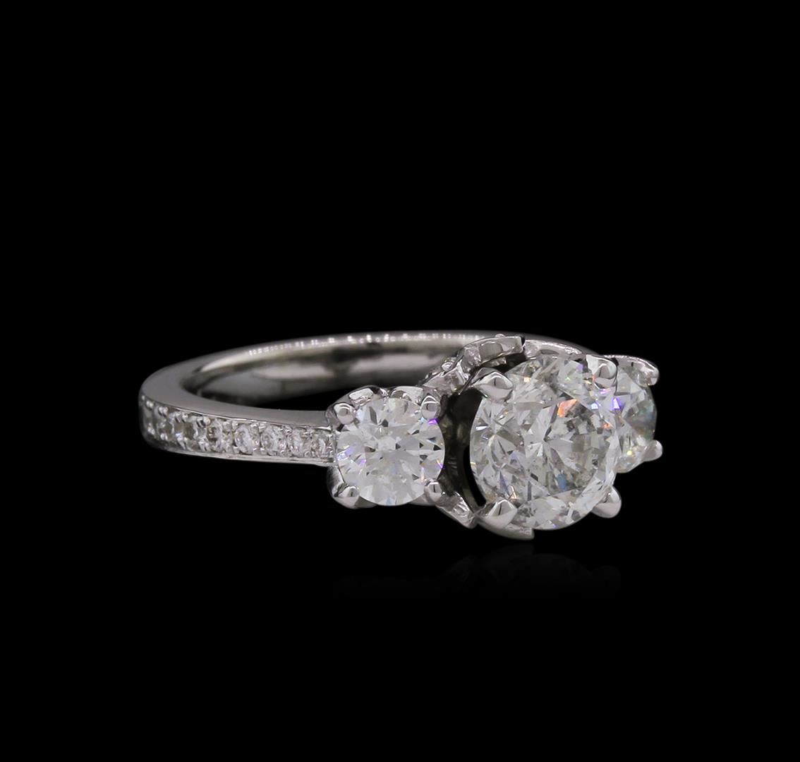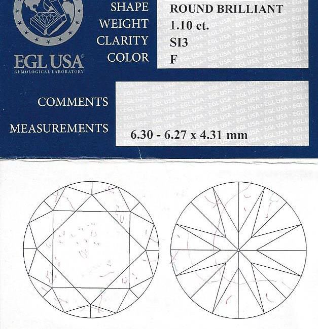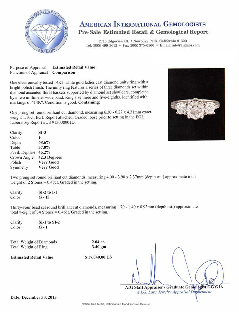 One prong set round brilliant cut diamond, measuring 6.30 - 6.27 x 4.31mm exact weight 1.10ct. EGL Report attached. Graded loose prior to setting in the EGL Laboratory Report #US 913008001D. Clarity: SI-3. Color: F. Depth 68.6%. Table 57.0%. Pavil. Depth%. 45.2%. Crown Angle 42.3 Degrees Two prong set round brilliant cut diamonds, measuring 4.00 - 3.90 x 2.37mm (depth est.) approximate total weight of 2 Stones = 0.48ct. Graded in the setting. Clarity: SI-2 to I-1. Color: G - H Thirty-Four bead set round brilliant cut diamonds, measuring 1.70 - 1.40 x 0.93mm (depth est.) approximate total weight of 34 Stones = 0.46ct. Graded in the setting. Clarity: SI-1 to SI-2. Color: G - I. Total Weight of Diamonds 2.04ct. Total Weight of Ring 3.40gm. AIG Appraised at $17,040.00.