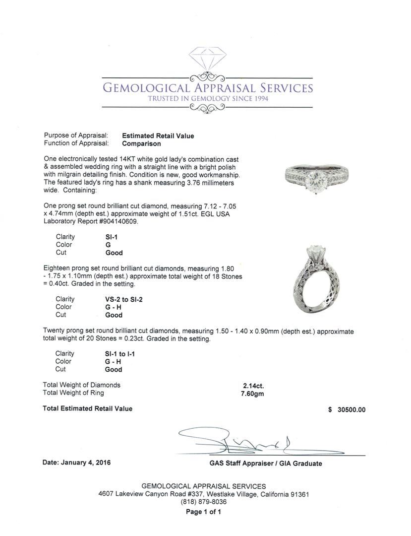 One electronically tested 14KT white gold lady's combination cast & assembled wedding ring with a straight line with a bright polish with milgrain detailing finish. The featured lady's ring has a shank measuring 3.76 millimeters wide. Condition is new, good workmanship. Containing: One prong set round brilliant cut diamond, measuring 7.12 - 7.05 x 4.74mm (depth est.) approximate weight of 1.51ct. EGL USA Laboratory Report #904140609. Clarity: SI-1. Color: Good Eighteen prong set round brilliant cut diamonds, measuring 1.80 - 1.75 x 1.10mm (depth est.) approximate total weight of 18 Stones = 0.40ct. Graded in the setting. Clarity: VS-2 to SI-2. Color: G - Good Twenty prong set round brilliant cut diamonds, measuring 1.50 - 1.40 x 0.90mm (depth est.) approximate total weight of 20 Stones = 0.23ct. Graded in the setting. Clarity: SI-1 to I-1. Color: G - Good. Total Weight of Diamonds 2.14ct. Total Weight of Ring 7.60gm. GAS Appraised at $30,500.00.