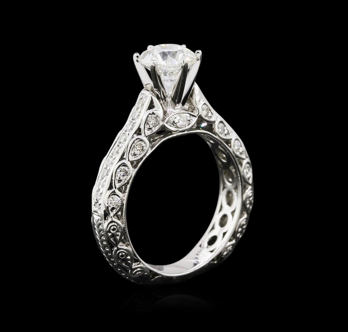 One electronically tested 14KT white gold lady's combination cast & assembled wedding ring with a straight line with a bright polish with milgrain detailing finish. The featured lady's ring has a shank measuring 3.76 millimeters wide. Condition is new, good workmanship. Containing: One prong set round brilliant cut diamond, measuring 7.12 - 7.05 x 4.74mm (depth est.) approximate weight of 1.51ct. EGL USA Laboratory Report #904140609. Clarity: SI-1. Color: Good Eighteen prong set round brilliant cut diamonds, measuring 1.80 - 1.75 x 1.10mm (depth est.) approximate total weight of 18 Stones = 0.40ct. Graded in the setting. Clarity: VS-2 to SI-2. Color: G - Good Twenty prong set round brilliant cut diamonds, measuring 1.50 - 1.40 x 0.90mm (depth est.) approximate total weight of 20 Stones = 0.23ct. Graded in the setting. Clarity: SI-1 to I-1. Color: G - Good. Total Weight of Diamonds 2.14ct. Total Weight of Ring 7.60gm. GAS Appraised at $30,500.00.