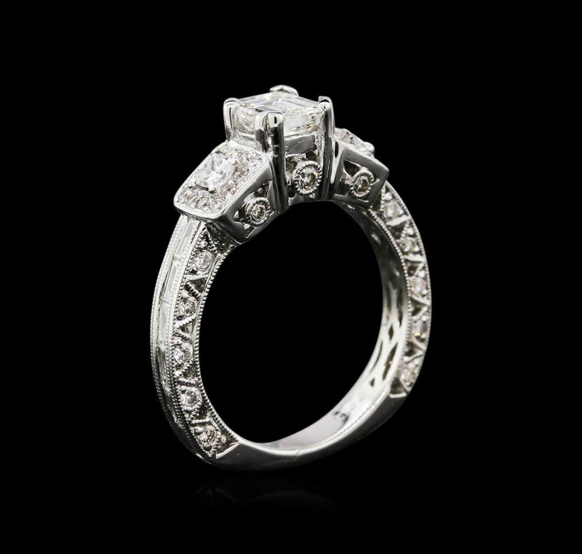 One electronically tested 18KT white gold lady's combination cast & assembled fashion wedding ring with a bright polish with milgrain detailing finish. The featured lady's ring has a shank measuring 3.40 millimeter in width. Identified with markings of "18K". Condition is new, good workmanship. Containing: One prong set emerald cut diamond, measuring 6.36 x 4.92 x 3.19mm (depth est.) approximate weight of 0.89ct. Graded in the setting. Clarity: VS-1. Color: Good Two prong set princess cut diamonds, measuring 2.95 x 2.85 x 2.14mm (depth est.) approximate total weight of 2 Stones = 0.30ct. Graded in the setting. Clarity: VS-2. Color: G - Good Twelve channel set baguette cut diamonds, measuring from 2.80 x 1.30 x 1.11mm (depth est.) to 3.00 x 1.50 x 1.28mm (depth est.) approximate total weight of 12 Stones = 0.54ct. Graded in the setting. Clarity: VS-1 to VS-2. Color: G - Good Fifty prong set round brilliant cut diamonds, measuring 1.40 - 1.30 x 0.85mm (depth est.) approximate total weight of 50 Stones = 0.50ct. Graded in the setting. Clarity: VS-2 to SI-1. Color: G - I. Cut Good. Total Weight of Diamonds 2.23ct. Total Weight of Wedding Ring 7.00gm. GAS Appraised at $11,615.00.