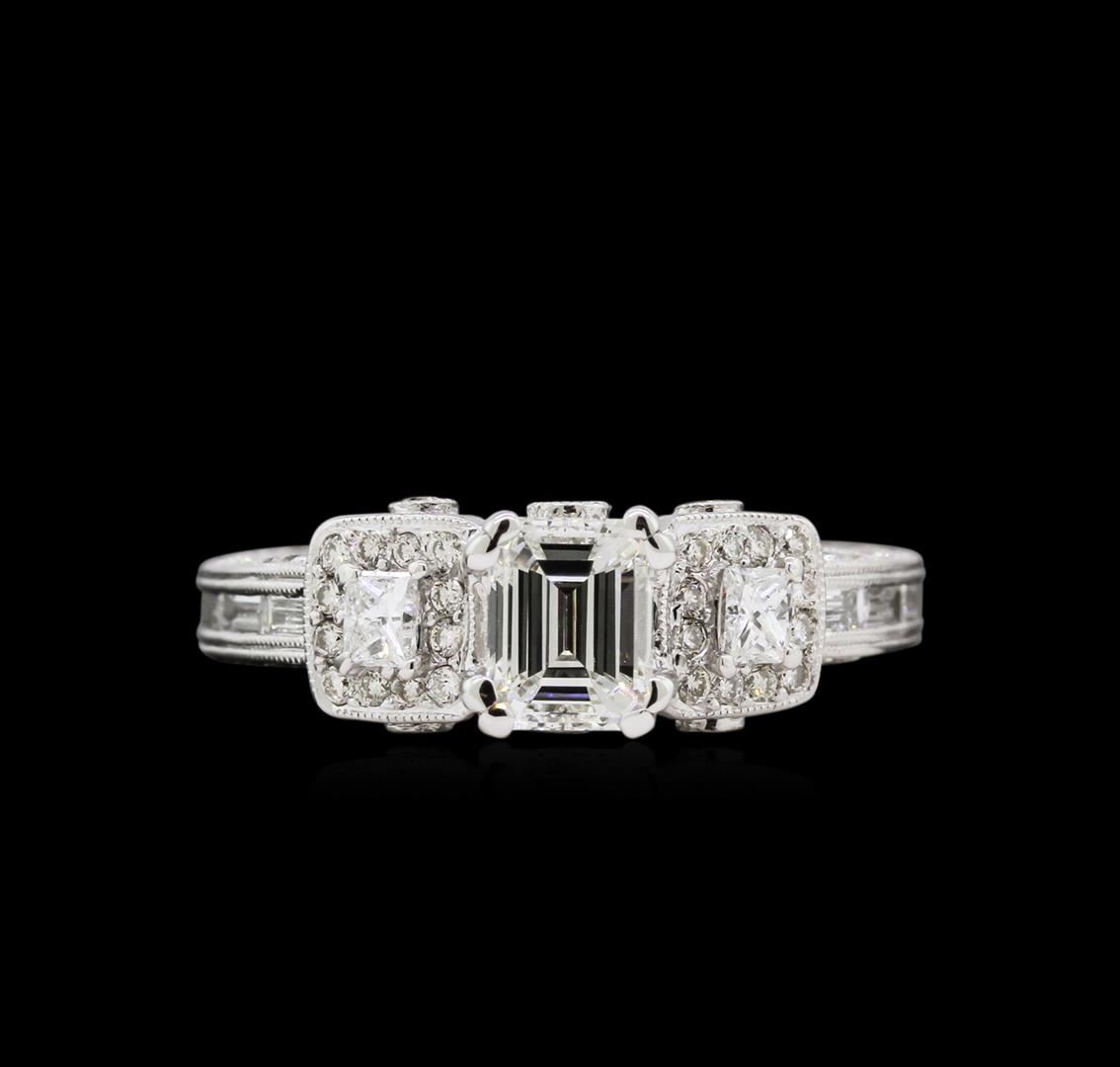 One electronically tested 18KT white gold lady's combination cast & assembled fashion wedding ring with a bright polish with milgrain detailing finish. The featured lady's ring has a shank measuring 3.40 millimeter in width. Identified with markings of "18K". Condition is new, good workmanship. Containing: One prong set emerald cut diamond, measuring 6.36 x 4.92 x 3.19mm (depth est.) approximate weight of 0.89ct. Graded in the setting. Clarity: VS-1. Color: Good Two prong set princess cut diamonds, measuring 2.95 x 2.85 x 2.14mm (depth est.) approximate total weight of 2 Stones = 0.30ct. Graded in the setting. Clarity: VS-2. Color: G - Good Twelve channel set baguette cut diamonds, measuring from 2.80 x 1.30 x 1.11mm (depth est.) to 3.00 x 1.50 x 1.28mm (depth est.) approximate total weight of 12 Stones = 0.54ct. Graded in the setting. Clarity: VS-1 to VS-2. Color: G - Good Fifty prong set round brilliant cut diamonds, measuring 1.40 - 1.30 x 0.85mm (depth est.) approximate total weight of 50 Stones = 0.50ct. Graded in the setting. Clarity: VS-2 to SI-1. Color: G - I. Cut Good. Total Weight of Diamonds 2.23ct. Total Weight of Wedding Ring 7.00gm. GAS Appraised at $11,615.00.