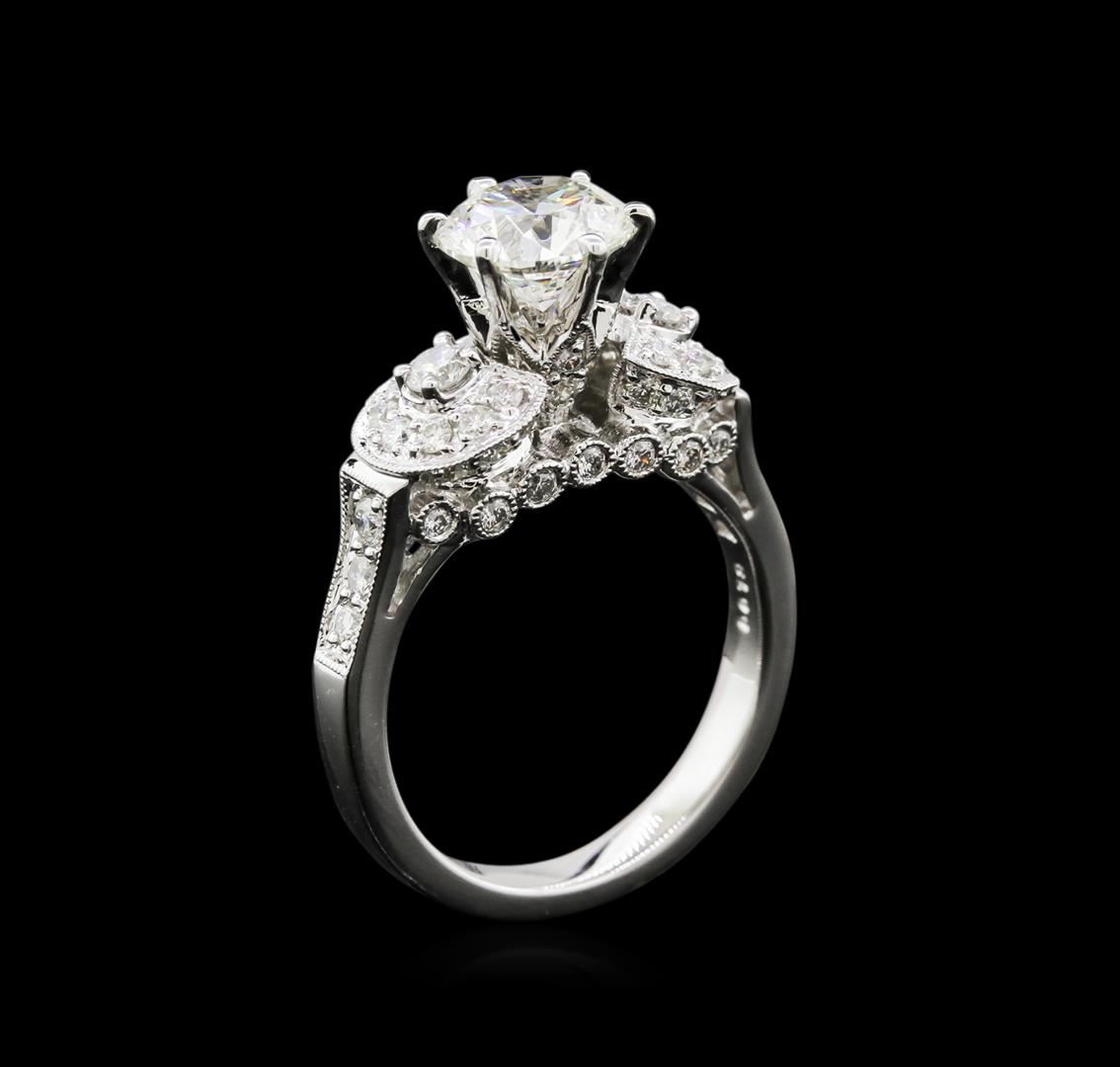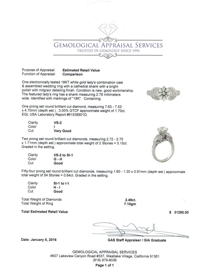 One electronically tested 18KT white gold lady's combination cast & assembled wedding ring with a cathedral shank with a bright polish with milgrain detailing finish. The featured lady's ring has a shank measuring 2.78 millimeters wide. Identified with markings of "18K". Condition is new, good workmanship. Containing: One prong set round brilliant cut diamond, measuring 7.63 - 7.53 x 4.70mm (depth est.) , 3.00.%. GTCF approximate weight of 1.70ct. EGL USA Laboratory Report #61538901D. Clarity: VS-2. Color: I. Cut Very Good Two prong set round brilliant cut diamonds, measuring 2.72 - 2.70 x 1.71mm (depth est.) approximate total weight of 2 Stones = 0.15ct. Graded in the setting. Clarity: VS-2 to SI-1. Color: G - Good Fifty-Four prong set round brilliant cut diamonds, measuring 1.60 - 1.30 x 0.91mm (depth est.) approximate total weight of 54 Stones = 0.64ct. Graded in the setting. Clarity: SI-1 to I-1. Color: H - I. Cut Good. Total Weight of Diamonds 2.49ct. Total Weight of Ring 7.10gm. GAS Appraised at $31,290.00.