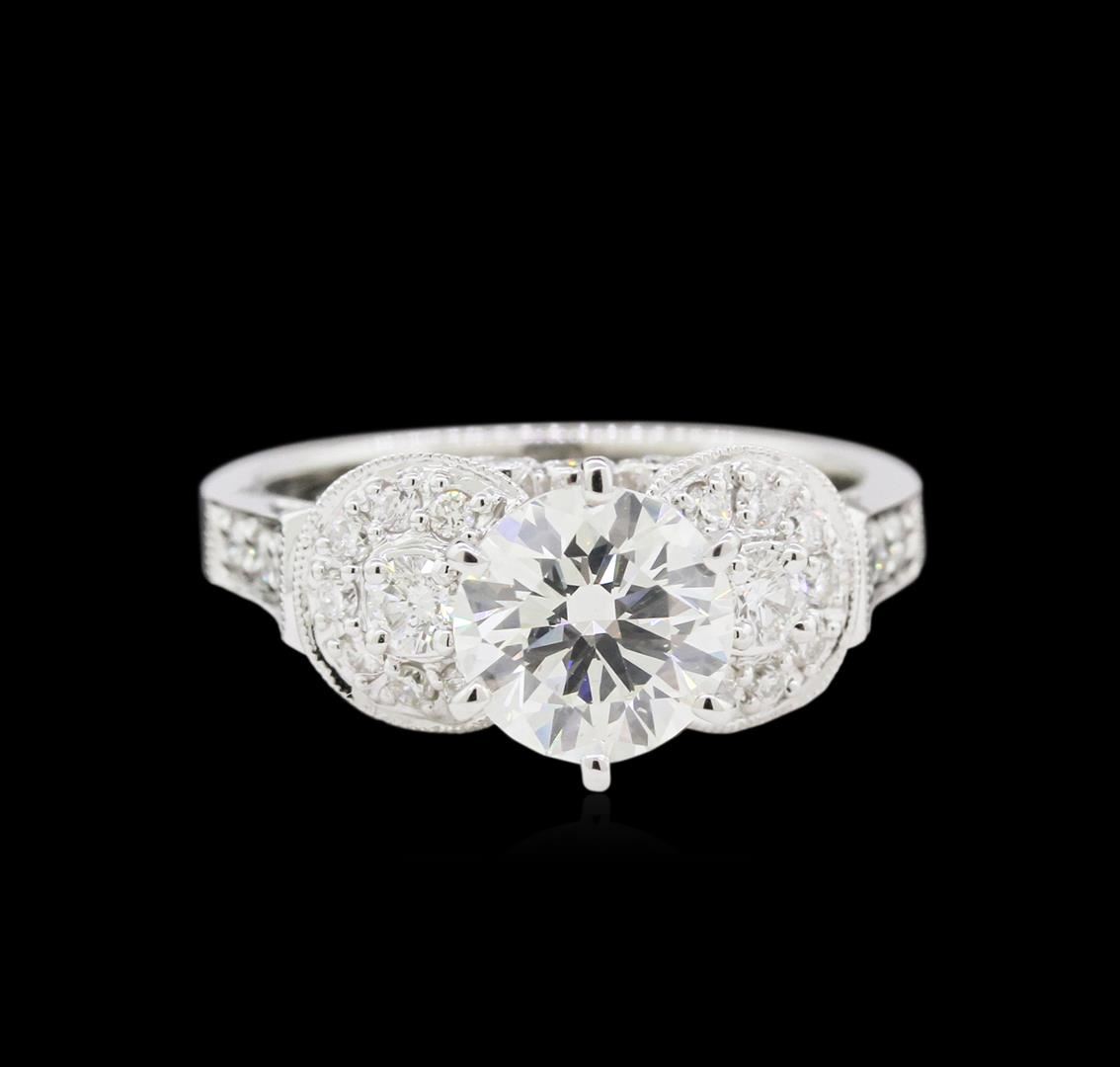 One electronically tested 18KT white gold lady's combination cast & assembled wedding ring with a cathedral shank with a bright polish with milgrain detailing finish. The featured lady's ring has a shank measuring 2.78 millimeters wide. Identified with markings of "18K". Condition is new, good workmanship. Containing: One prong set round brilliant cut diamond, measuring 7.63 - 7.53 x 4.70mm (depth est.) , 3.00.%. GTCF approximate weight of 1.70ct. EGL USA Laboratory Report #61538901D. Clarity: VS-2. Color: I. Cut Very Good Two prong set round brilliant cut diamonds, measuring 2.72 - 2.70 x 1.71mm (depth est.) approximate total weight of 2 Stones = 0.15ct. Graded in the setting. Clarity: VS-2 to SI-1. Color: G - Good Fifty-Four prong set round brilliant cut diamonds, measuring 1.60 - 1.30 x 0.91mm (depth est.) approximate total weight of 54 Stones = 0.64ct. Graded in the setting. Clarity: SI-1 to I-1. Color: H - I. Cut Good. Total Weight of Diamonds 2.49ct. Total Weight of Ring 7.10gm. GAS Appraised at $31,290.00.