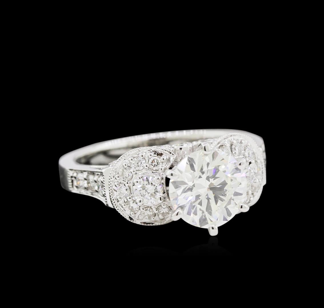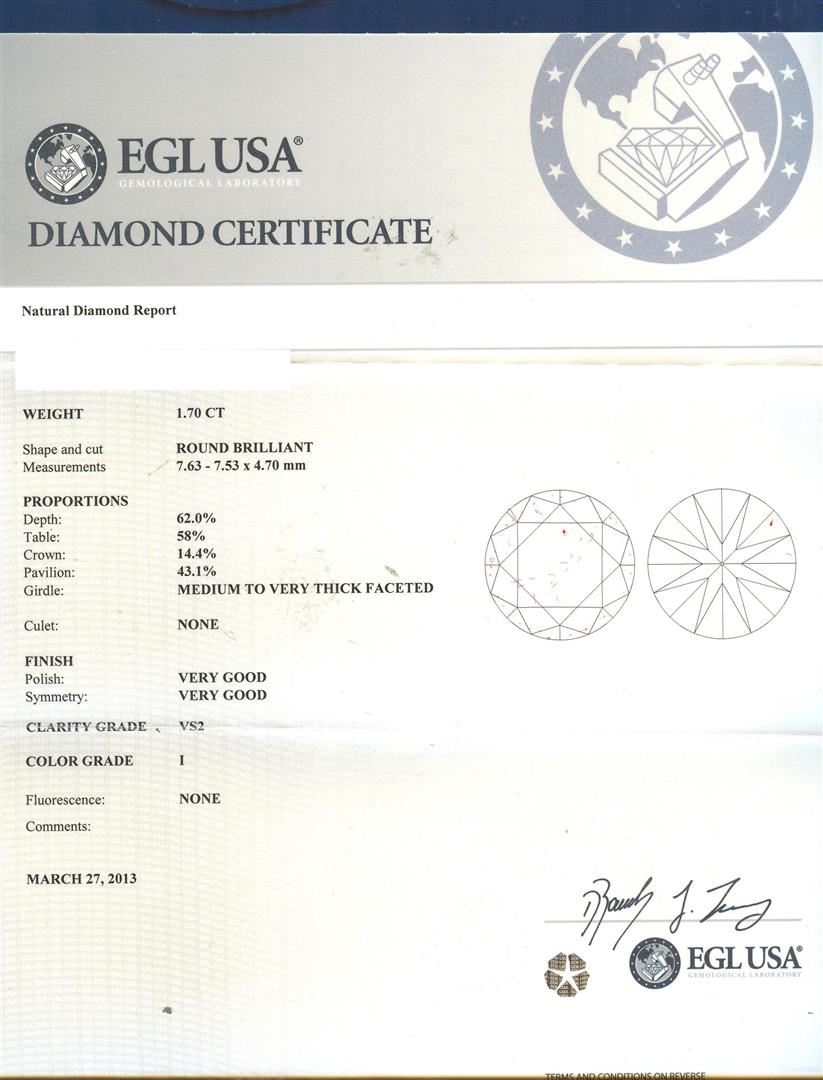 One electronically tested 18KT white gold lady's combination cast & assembled wedding ring with a cathedral shank with a bright polish with milgrain detailing finish. The featured lady's ring has a shank measuring 2.78 millimeters wide. Identified with markings of "18K". Condition is new, good workmanship. Containing: One prong set round brilliant cut diamond, measuring 7.63 - 7.53 x 4.70mm (depth est.) , 3.00.%. GTCF approximate weight of 1.70ct. EGL USA Laboratory Report #61538901D. Clarity: VS-2. Color: I. Cut Very Good Two prong set round brilliant cut diamonds, measuring 2.72 - 2.70 x 1.71mm (depth est.) approximate total weight of 2 Stones = 0.15ct. Graded in the setting. Clarity: VS-2 to SI-1. Color: G - Good Fifty-Four prong set round brilliant cut diamonds, measuring 1.60 - 1.30 x 0.91mm (depth est.) approximate total weight of 54 Stones = 0.64ct. Graded in the setting. Clarity: SI-1 to I-1. Color: H - I. Cut Good. Total Weight of Diamonds 2.49ct. Total Weight of Ring 7.10gm. GAS Appraised at $31,290.00.