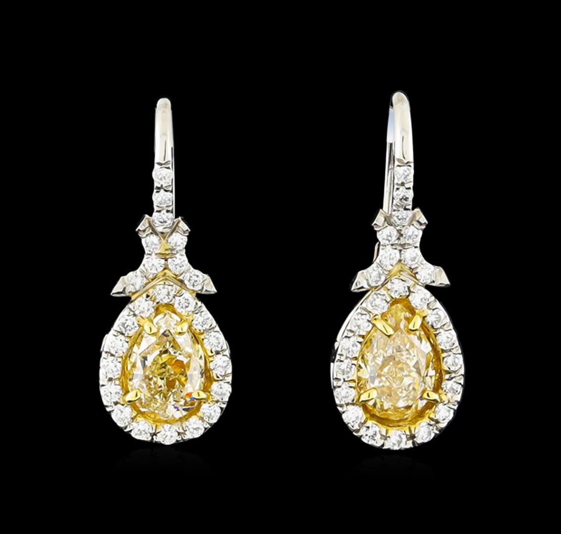 One pair of earrings featuring: platinum consisting of two (2) pear brilliant cut diamonds measuring 7.50 x 5.00 x 3.57mm weighing 2.03ct. Diamonds are fancy light to fancy yellow in color and VS2 in clarity. The earrings also contain fifty (50) round brilliant cut diamonds weighing 0.59ct. Diamonds are G-H in color and VS1-VS2 in clarity. Grading as mounting permit. EGL USA Appraised.