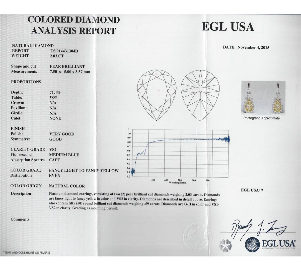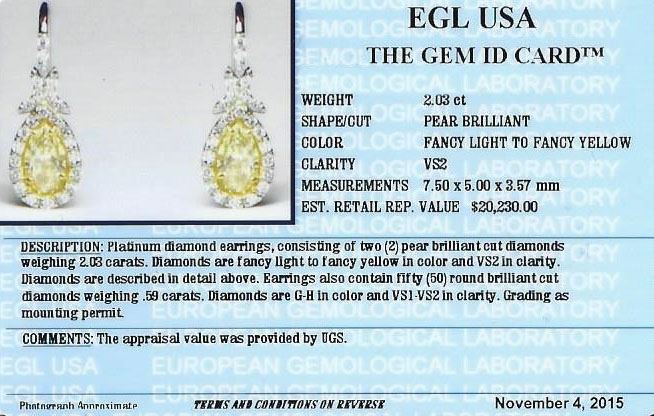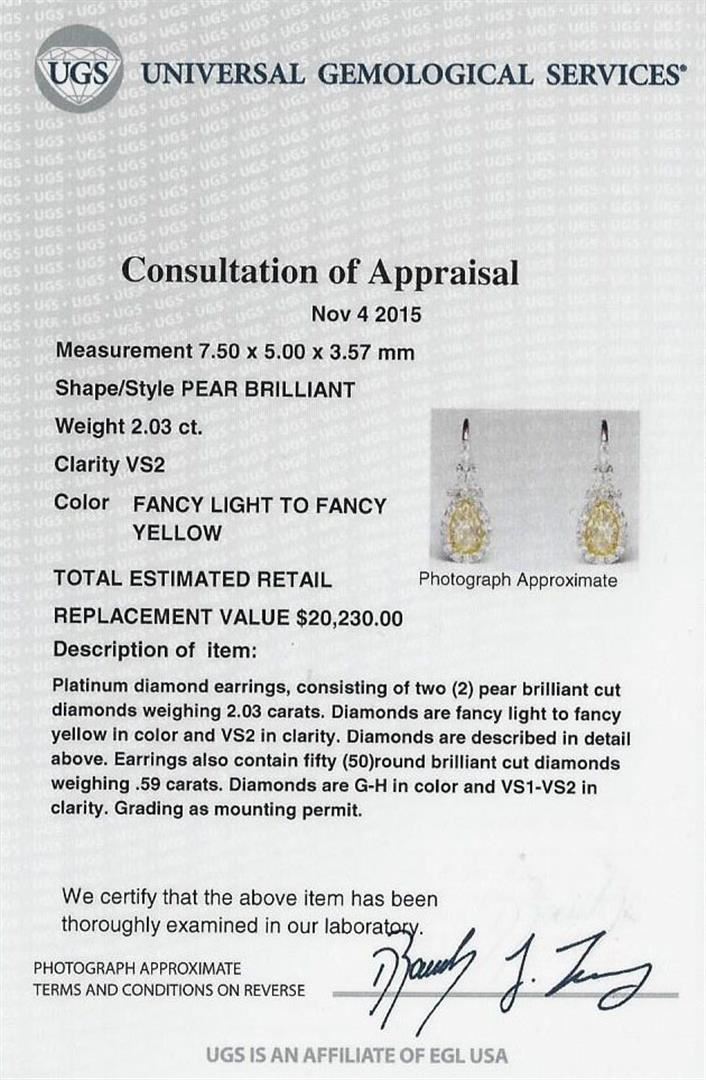 One pair of earrings featuring: platinum consisting of two (2) pear brilliant cut diamonds measuring 7.50 x 5.00 x 3.57mm weighing 2.03ct. Diamonds are fancy light to fancy yellow in color and VS2 in clarity. The earrings also contain fifty (50) round brilliant cut diamonds weighing 0.59ct. Diamonds are G-H in color and VS1-VS2 in clarity. Grading as mounting permit. EGL USA Appraised.