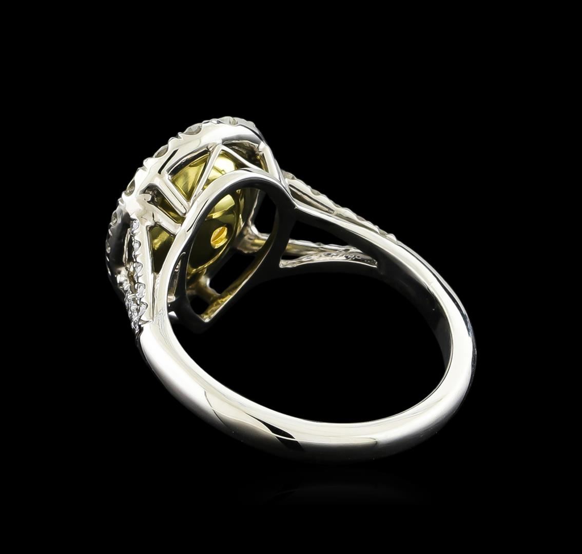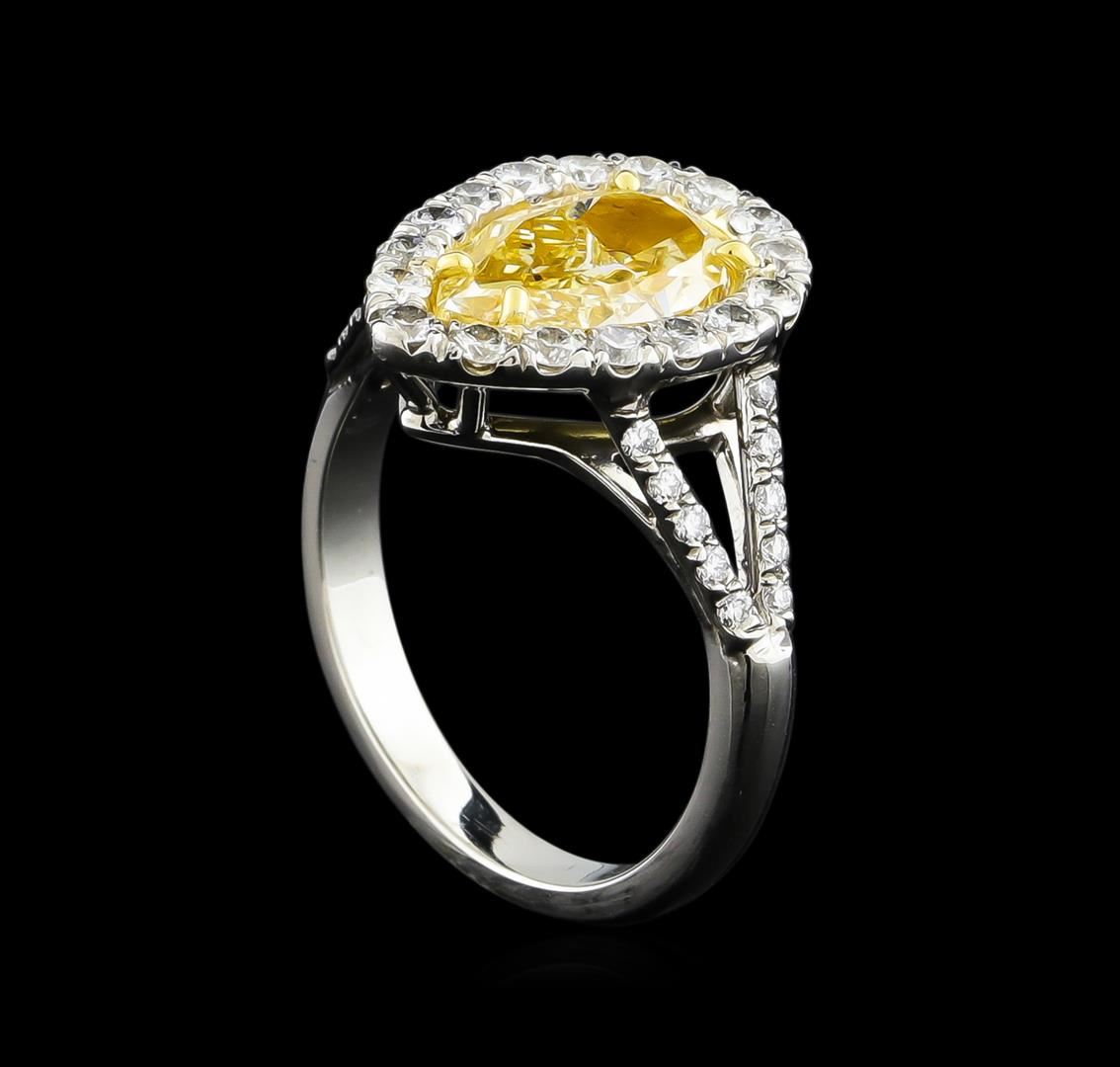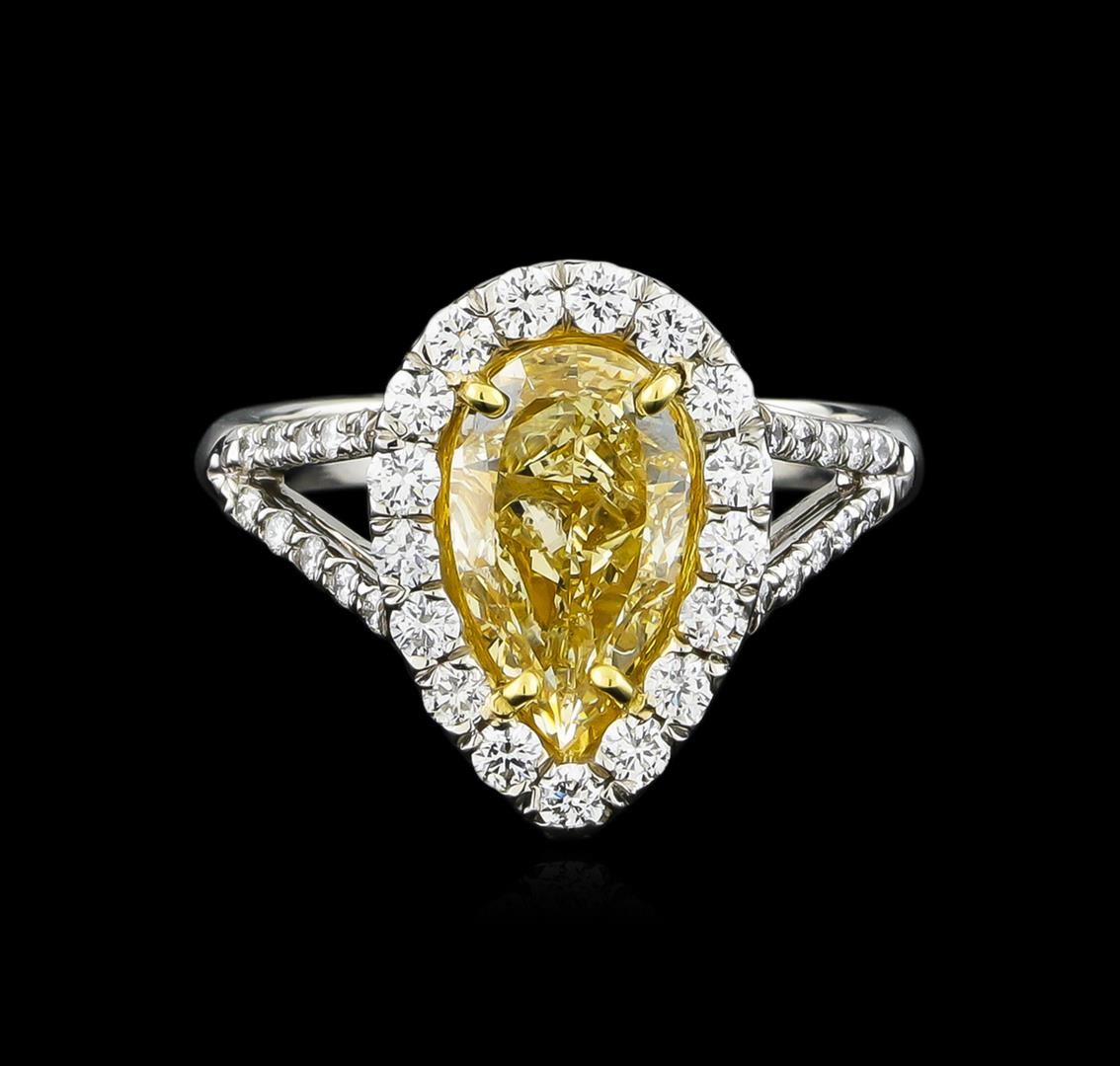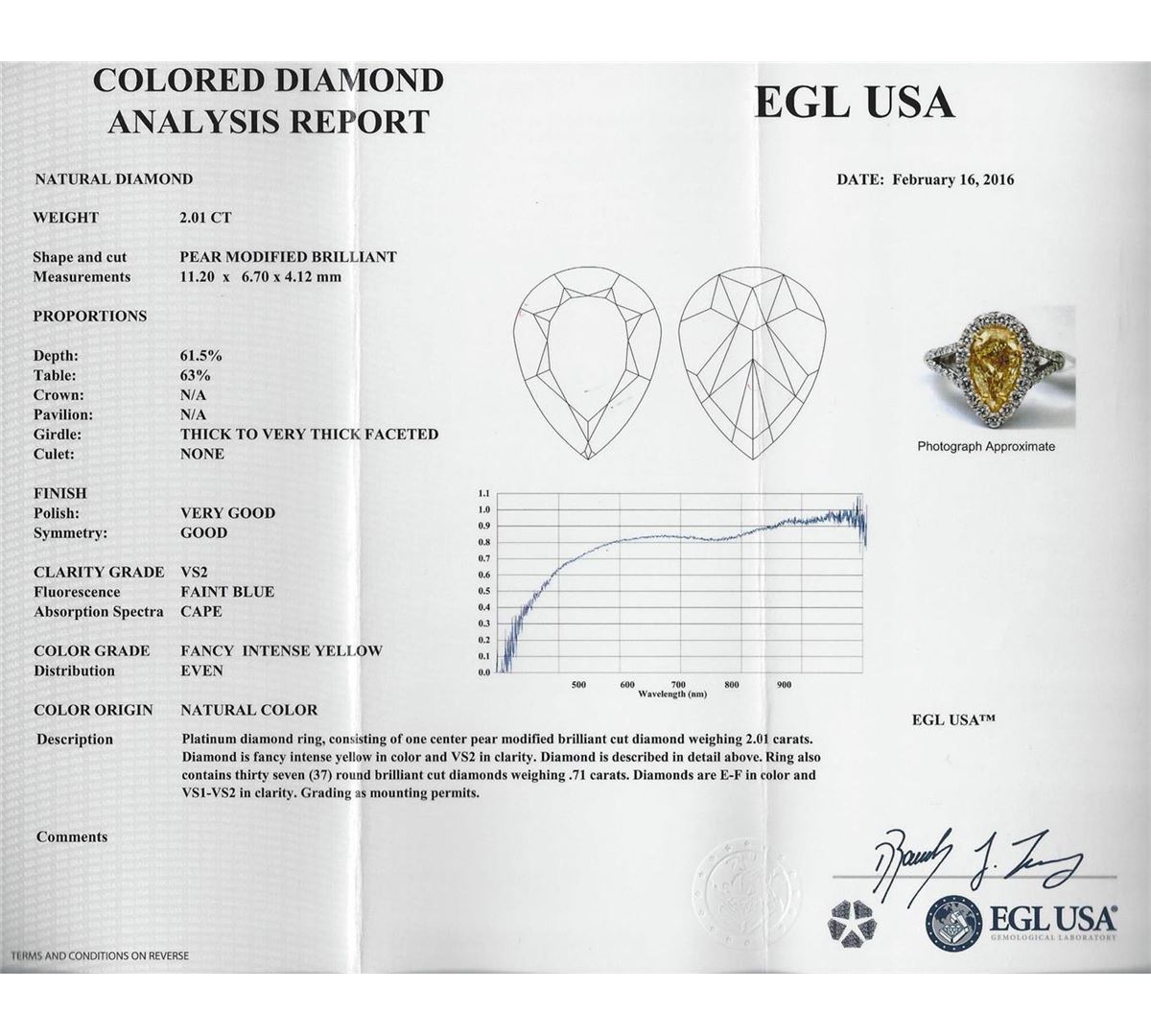 One ring featuring: platinum consisting of one center pear modified brilliant cut diamond measuring 11.20 x 6.70 x 4.12mm weighing 2.01ct. Diamond is fancy intense yellow in color and VS2 in clarity. Ring also contains thirty seven (37) round brilliant cut diamonds weighing 0.71ct. Diamonds are E-F in color and VS1-VS2 in clarity. Grading as mounting permits. EGL USA Appraised.
