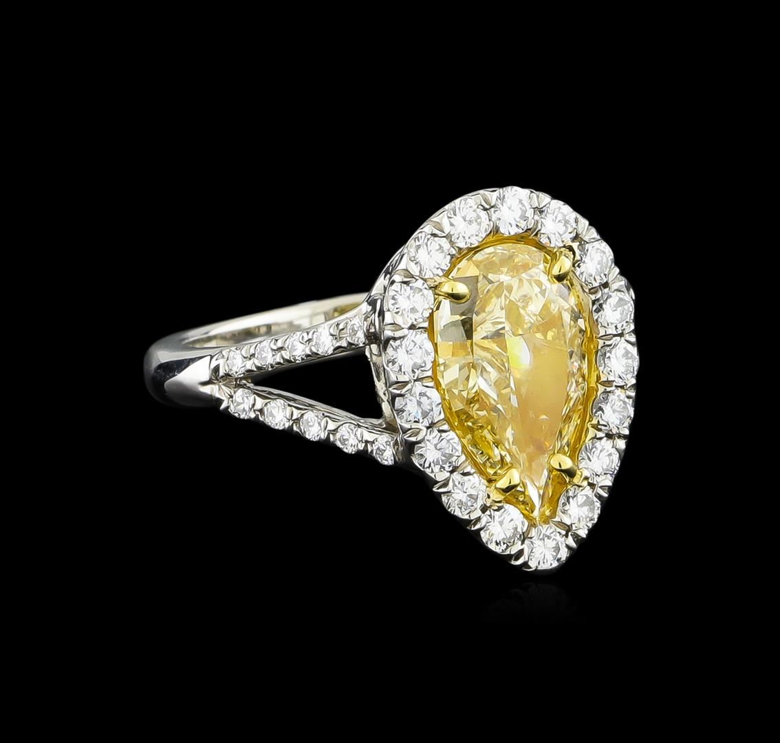One ring featuring: platinum consisting of one center pear modified brilliant cut diamond measuring 11.20 x 6.70 x 4.12mm weighing 2.01ct. Diamond is fancy intense yellow in color and VS2 in clarity. Ring also contains thirty seven (37) round brilliant cut diamonds weighing 0.71ct. Diamonds are E-F in color and VS1-VS2 in clarity. Grading as mounting permits. EGL USA Appraised.