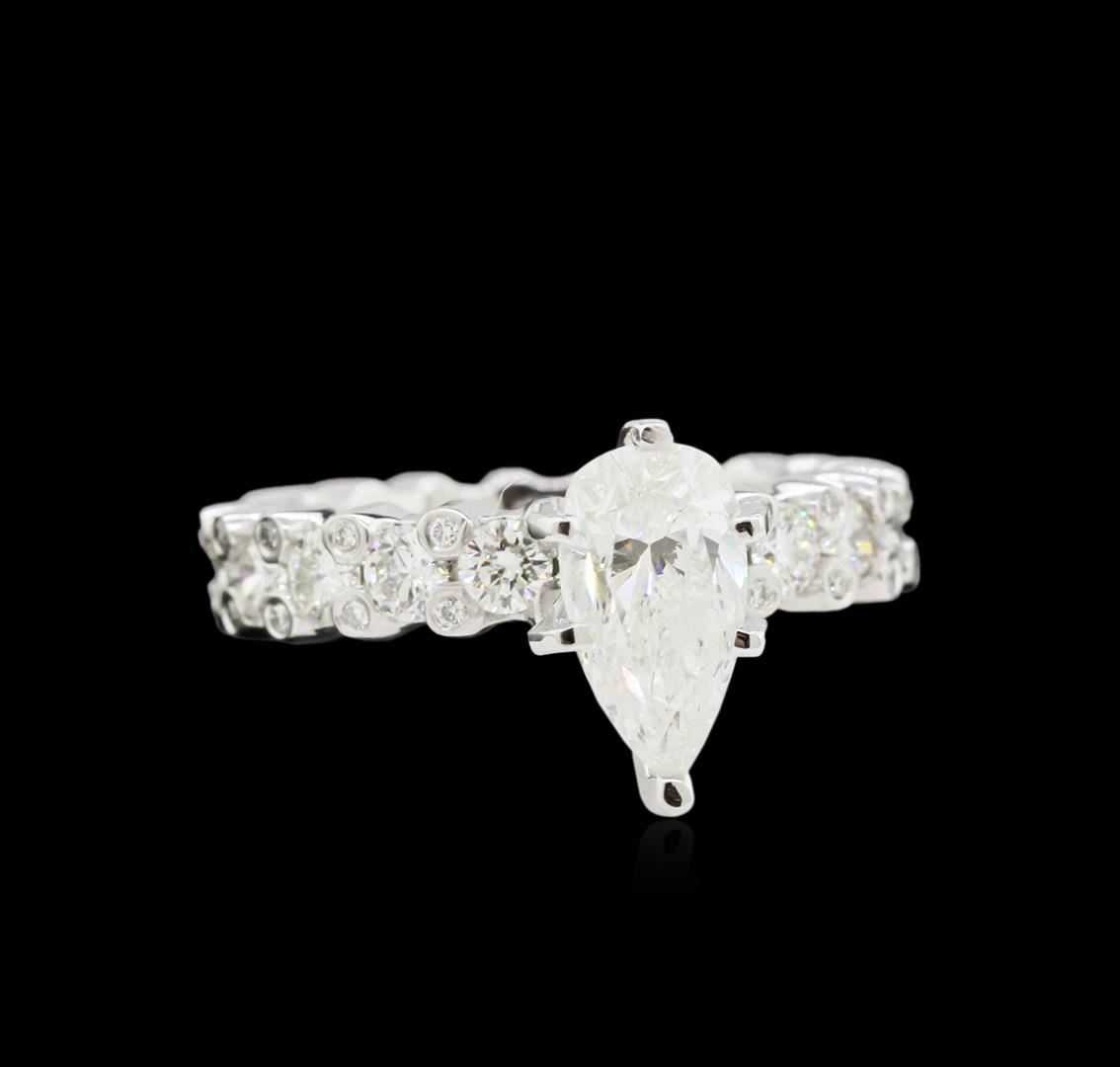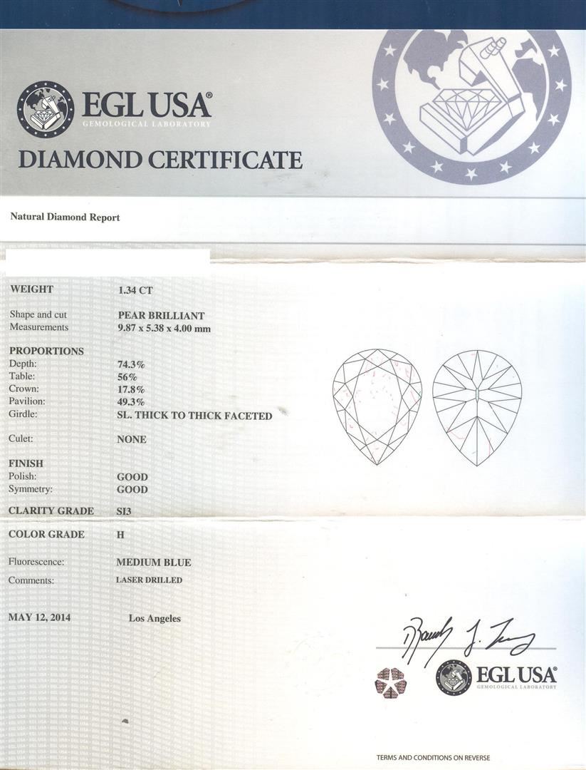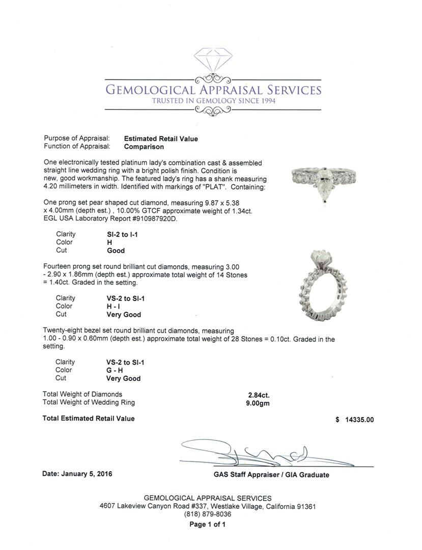 One electronically tested platinum lady's combination cast & assembled straight line wedding ring with a bright polish finish. The featured lady's ring has a shank measuring 4.20 millimeters in width. Identified with markings of "PLAT". Condition is new, good workmanship. Containing: One prong set pear shaped cut diamond, measuring 9.87 x 5.38 x 4.00mm (depth est.) , 10.00.%. GTCF approximate weight of 1.34ct. EGL USA Laboratory Report #910987920D. Clarity: SI-2 to I-1. Color: Good Fourteen prong set round brilliant cut diamonds, measuring 3.00 - 2.90 x 1.86mm (depth est.) approximate total weight of 14 Stones = 1.40ct. Graded in the setting. Clarity: VS-2 to SI-1. Color: H - I. Cut Very Good Twenty-Eight bezel set round brilliant cut diamonds, measuring 1.00 - 0.90 x 0.60mm (depth est.) approximate total weight of 28 Stones = 0.10ct. Graded in the setting. Clarity: VS-2 to SI-1. Color: G - Very Good. Total Weight of Diamonds 2.84ct. Total Weight of Wedding Ring 9.00gm. GAS Appraised at $14,335.00.