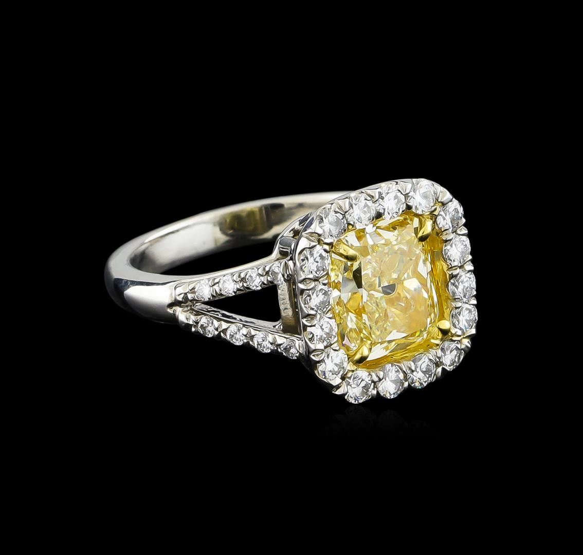 One ring featuring: platinum consisting of one center cushion modified brilliant cut diamond measuring 7.70 x 6.80 x 4.57mm weighing 2.18ct. Diamond is fancy intense yellow in color and VS1 in clarity. Ring also contains thirty two (32) round brilliant cut diamonds weighing 0.68ct. Diamonds are E-F in color and VS1-VS2 in clarity. Grading as mounting permits. EGL USA Appraised.