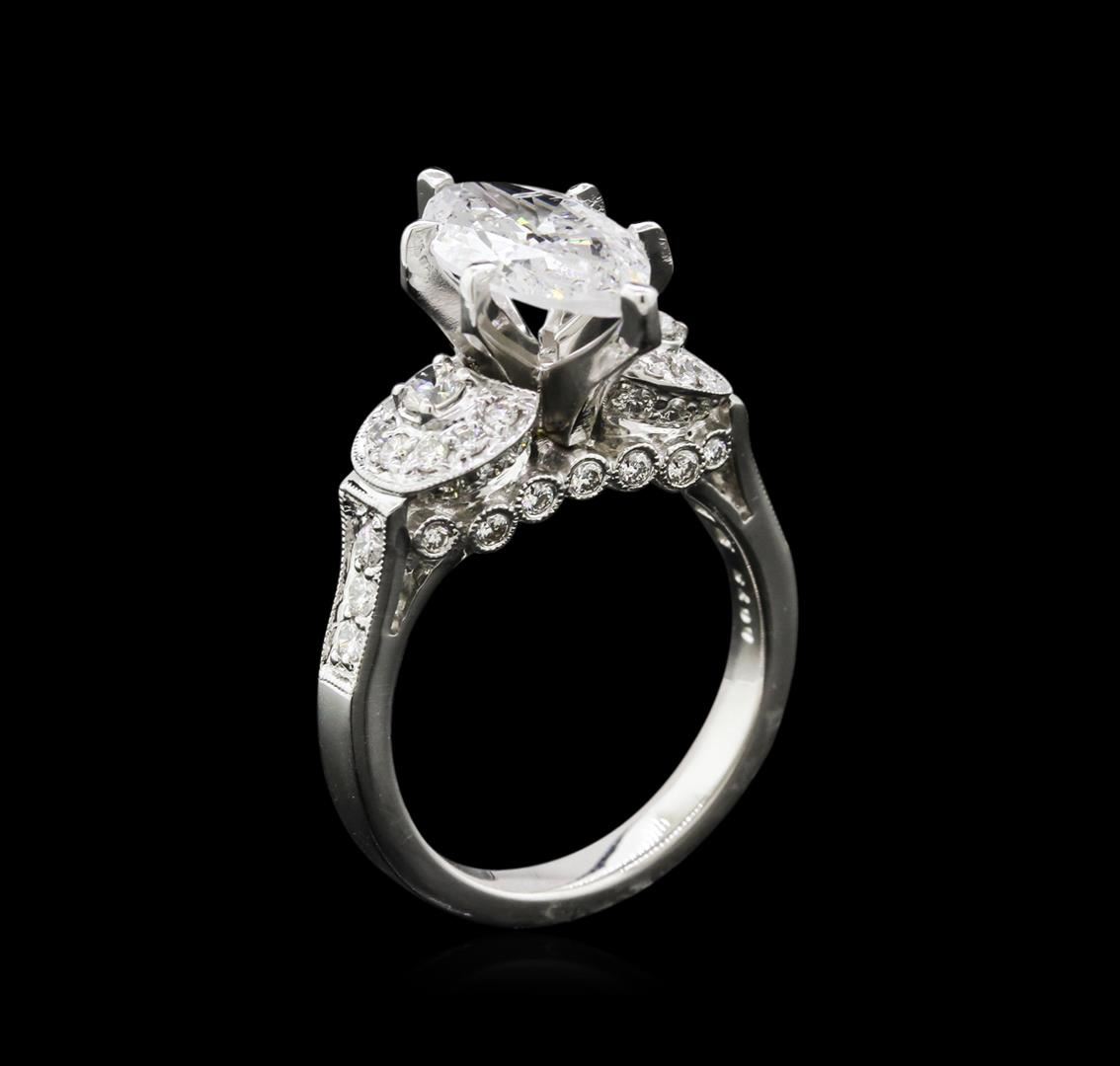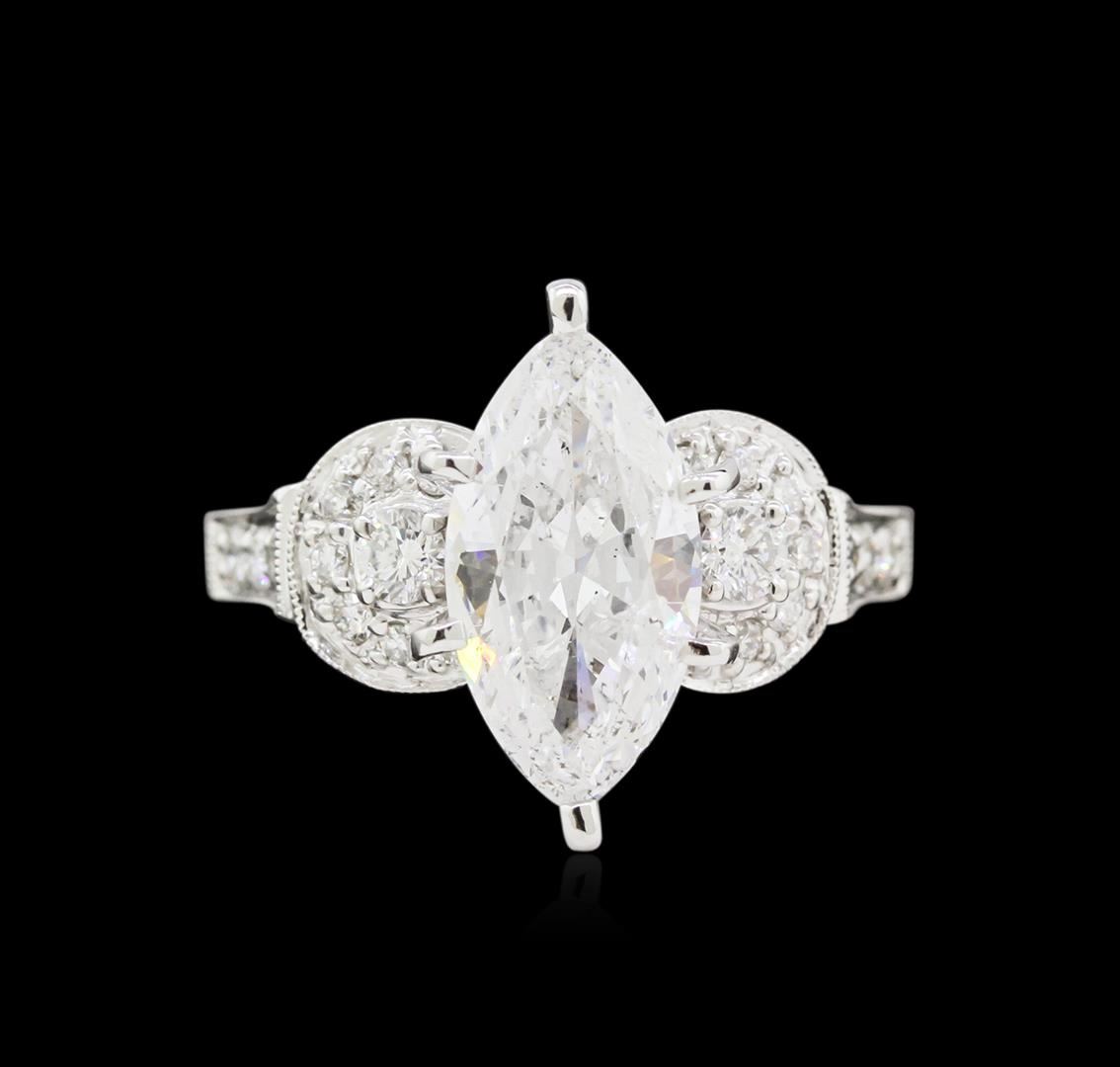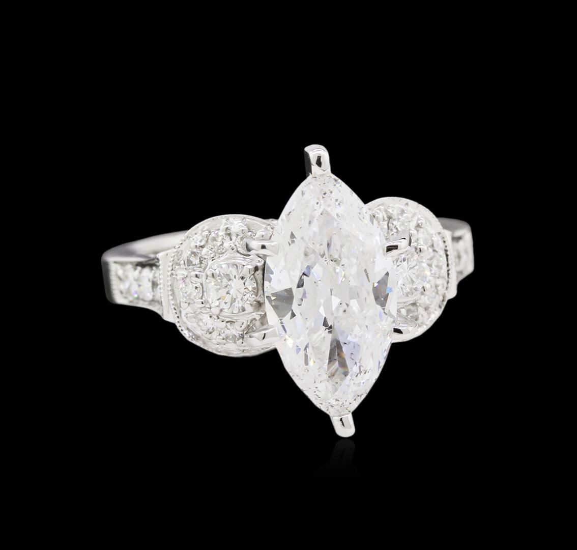 One electronically tested 18KT white gold lady's cast wedding ring with a bright polish with milgrain detailing finish. The featured lady's ring has a shank measuring 2.85 millimeters wide. Identified with markings of "18K". Condition is new, good workmanship. Containing: One prong set marquise shaped cut diamond, measuring 13.42 x 7.11 x 3.74mm (depth est.) , 10.00.%. GTCF approximate weight of 2.35ct. EGL USA Laboratory Report #914321101. Clarity: I-1. Color: Good Two prong set round brilliant cut diamonds, measuring 2.98 - 2.90 x 1.85mm (depth est.) approximate total weight of 2 Stones = 0.20ct. Graded in the setting. Clarity: SI-1 to SI-2. Color: G - Good Six prong set round brilliant cut diamonds, measuring 2.00 - 1.80 x 1.16mm (depth est.) approximate total weight of 6 Stones = 0.15ct. Graded in the setting. Clarity: SI-1 to SI-2. Color: H - I. Cut Good Forty prong set round brilliant cut diamonds, measuring 1.50 - 1.30 x 0.84mm (depth est.) approximate total weight of 40 Stones = 0.40ct. Graded in the setting. Clarity: SI-1 to SI-2. Color: G - I. Cut Good. Total Weight of Diamonds 3.10ct. Total Weight of Ring 7.70gm. GAS Appraised at $25,935.00.