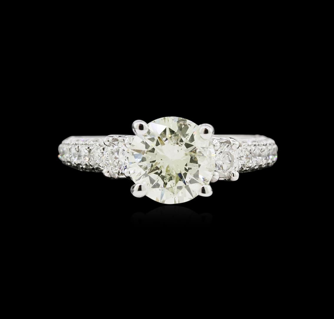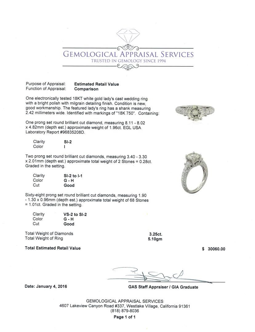 One electronically tested 18KT white gold lady's cast wedding ring with a bright polish with milgrain detailing finish. The featured lady's ring has a shank measuring 2.42 millimeters wide. Identified with markings of "18K 750". Condition is new, good workmanship. Containing: One prong set round brilliant cut diamond, measuring 8.11 - 8.02 x 4.82mm (depth est.) approximate weight of 1.96ct. EGL USA Laboratory Report #96835208D. Clarity: SI-2. Color: I Two prong set round brilliant cut diamonds, measuring 3.40 - 3.30 x 2.01mm (depth est.) approximate total weight of 2 Stones = 0.28ct. Graded in the setting. Clarity: SI-2 to I-1. Color: G - Good Sixty-Eight prong set round brilliant cut diamonds, measuring 1.90 - 1.30 x 0.96mm (depth est.) approximate total weight of 68 Stones = 1.01ct. Graded in the setting. Clarity: VS-2 to SI-2. Color: G - Good. Total Weight of Diamonds 3.25ct. Total Weight of Ring 5.10gm. GAS Appraised at $30,060.00.
