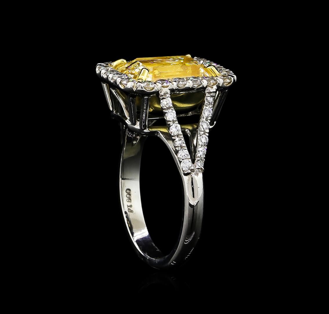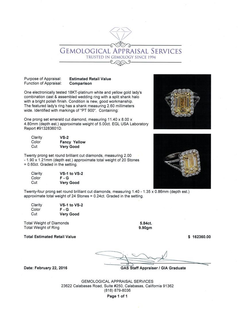One electronically tested 18KT-platinum white and yellow gold lady's combination cast & assembled wedding ring with a split shank halo with a bright polish finish. The featured lady's ring has a shank measuring 2.60 millimeters wide. Identified with markings of "PT 900". Condition is new, good workmanship. Containing: One prong set emerald cut diamond, measuring 11.40 x 8.00 x 4.80mm (depth est.) approximate weight of 5.00ct. EGL USA Laboratory Report #913283601D. Clarity: VS-2 Cut Very Good Twenty prong set round brilliant cut diamonds, measuring 2.00 - 1.90 x 1.21mm (depth est.) approximate total weight of 20 Stones = 0.60ct. Graded in the setting. Clarity: VS-1 to VS-2. Color: F - G. Cut Very Good Twenty-Four prong set round brilliant cut diamonds, measuring 1.40 - 1.35 x 0.86mm (depth est.) approximate total weight of 24 Stones = 0.24ct. Graded in the setting. Clarity: VS-1 to VS-2. Color: F - Very Good. Total Weight of Diamonds 5.84ct. Total Weight of Ring 9.90gm. GAS Appraised at $162,360.00.