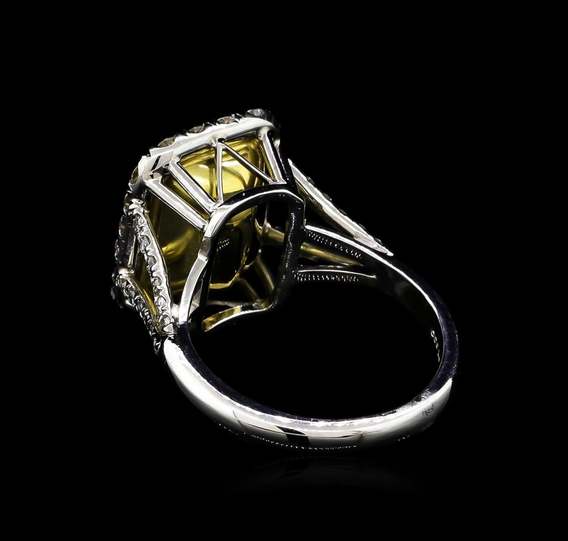 One electronically tested 18KT-platinum white and yellow gold lady's combination cast & assembled wedding ring with a split shank halo with a bright polish finish. The featured lady's ring has a shank measuring 2.60 millimeters wide. Identified with markings of "PT 900". Condition is new, good workmanship. Containing: One prong set emerald cut diamond, measuring 11.40 x 8.00 x 4.80mm (depth est.) approximate weight of 5.00ct. EGL USA Laboratory Report #913283601D. Clarity: VS-2 Cut Very Good Twenty prong set round brilliant cut diamonds, measuring 2.00 - 1.90 x 1.21mm (depth est.) approximate total weight of 20 Stones = 0.60ct. Graded in the setting. Clarity: VS-1 to VS-2. Color: F - G. Cut Very Good Twenty-Four prong set round brilliant cut diamonds, measuring 1.40 - 1.35 x 0.86mm (depth est.) approximate total weight of 24 Stones = 0.24ct. Graded in the setting. Clarity: VS-1 to VS-2. Color: F - Very Good. Total Weight of Diamonds 5.84ct. Total Weight of Ring 9.90gm. GAS Appraised at $162,360.00.