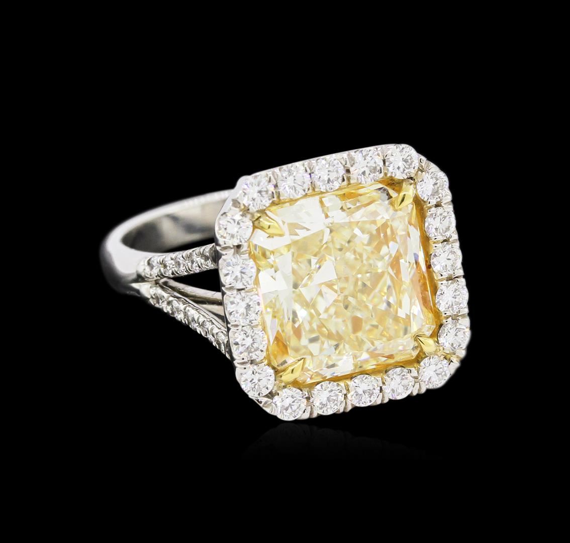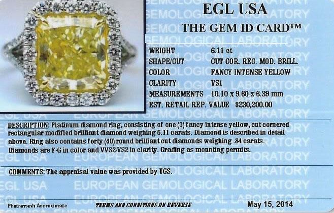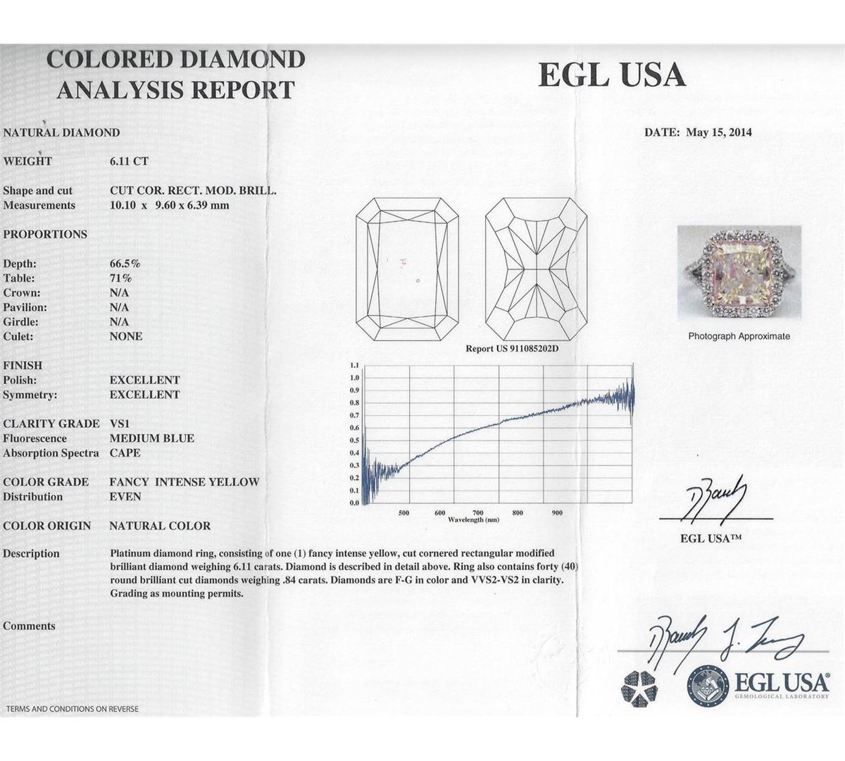 One EGL USA Certified platinum diamond ring, consisting of one (1) fancy intense yellow, cut cornered rectangular modified brilliant diamond weighing 6.11 carats. Clarity: VS1. Measurements: 10.10 x 9.60 x 6.39mm. Ring also contains forty (40) round brilliant cut diamonds weighing 0.84 carats. Diamonds are F-G in color and VVS2-VS2 in clarity. Total Weight of Ring: 9.40 grams. UGS Appraised at $230,200.00.
