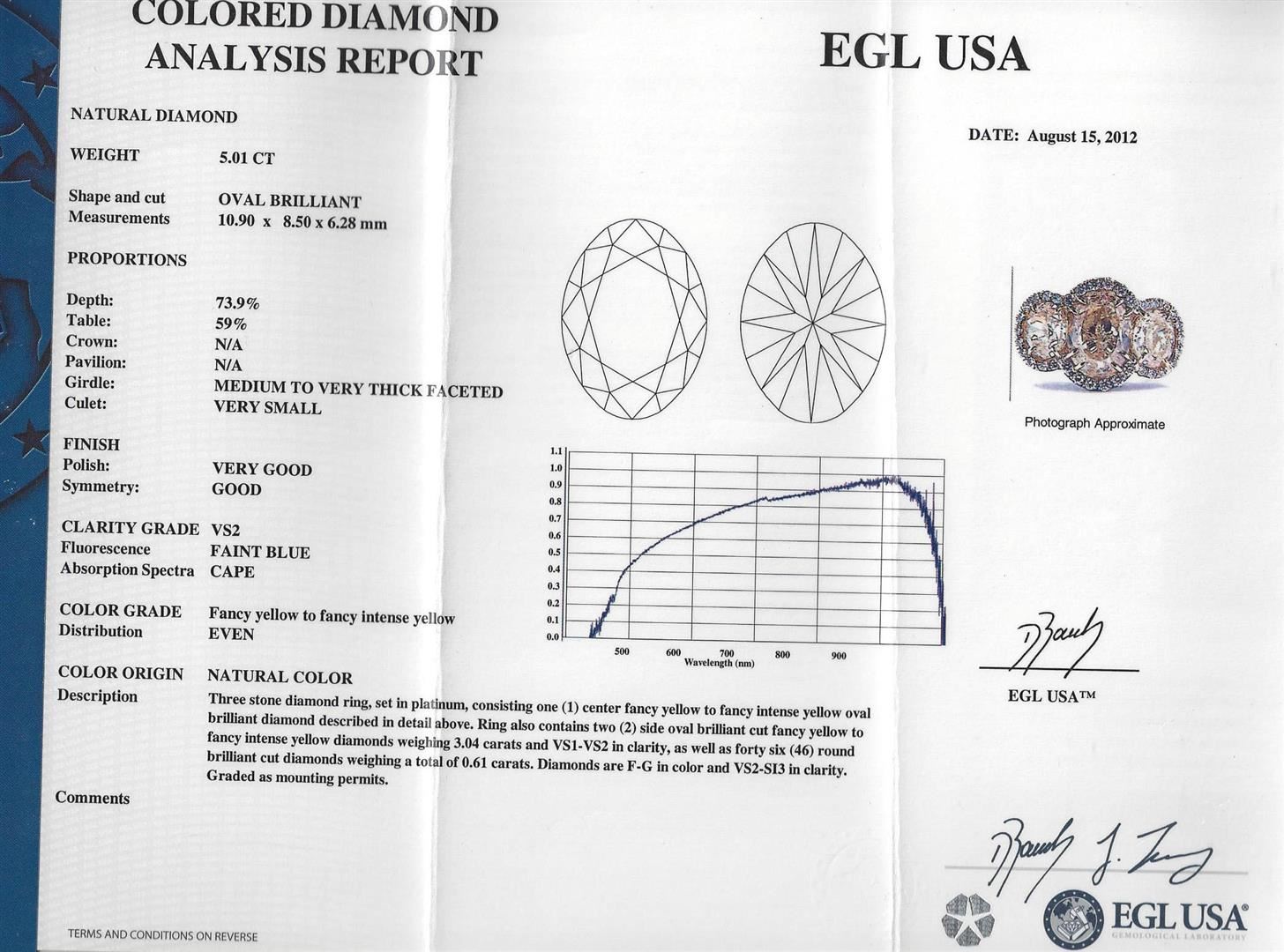 One three stone ring featuring: platinum consisting of one center oval brilliant diamond measuring 10.90 x 8.50 x 6.28mm weighing 5.01ct. Diamond is fancy yellow to fancy intense yellow in color and VS2 in clarity. Ring also contains two (2) side oval brilliant cut fancy yellow to fancy intense yellow diamonds weighing 3.04ct and VS1-VS2 in clarity, as well as forty six (46) round brilliant cut diamonds weighing 0.61ct. Diamonds are F-G in color and VS2-SI3 in clarity. EGL USA Appraised.