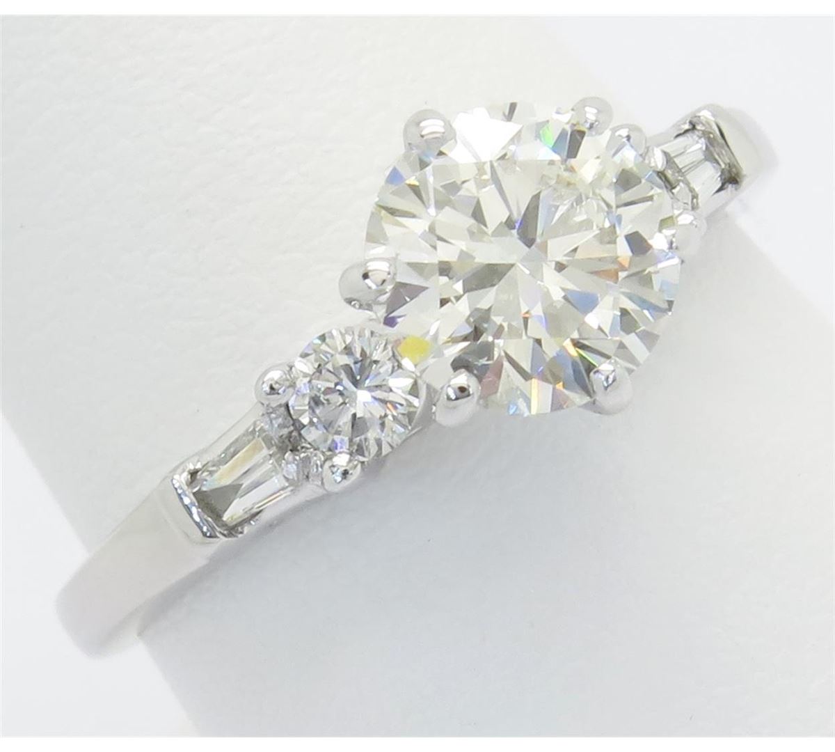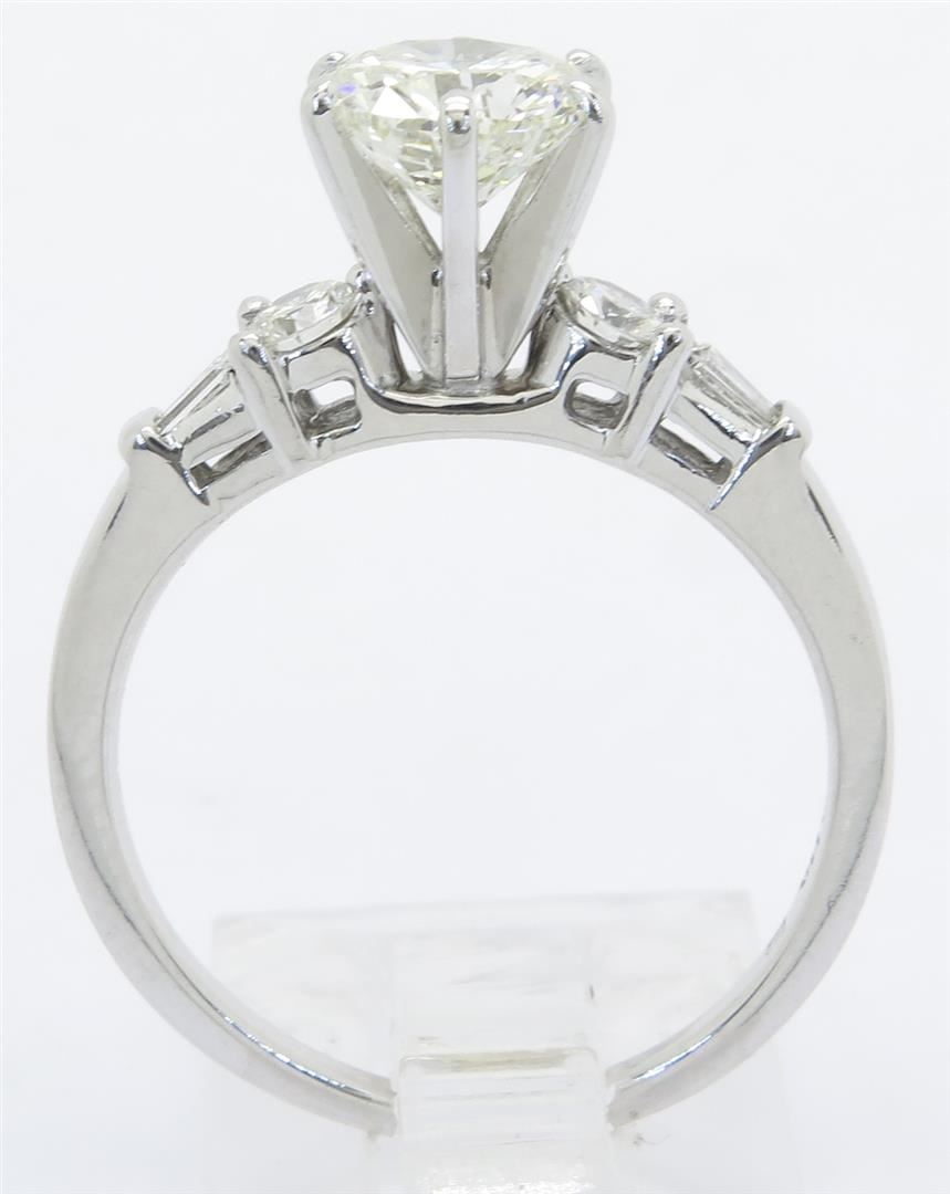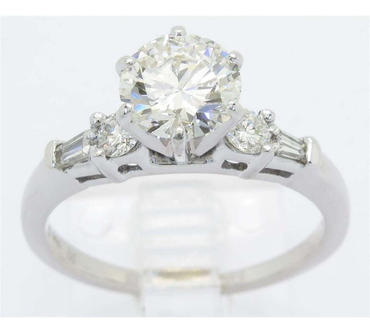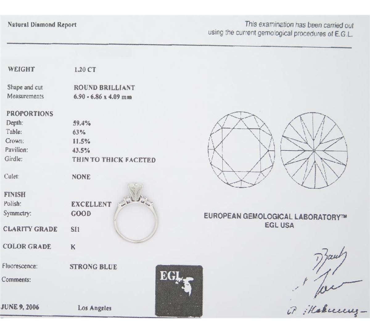 One tested 14K white gold diamond ring. Containing: One prong set EGL USA Certified Round Brilliant Cut Diamond, Size: 1.20CT, Clarity: SI1, Color: K. Two Round Brilliant Cut Diamonds, two Tapered Baguette Cut Diamonds. Total weight of 5 diamonds:1.50CTW. All diamonds are graded in the mounting unless otherwise stated. Weight of ring: 3.4 grams, Size: 6.25. EGL USA Appraised.