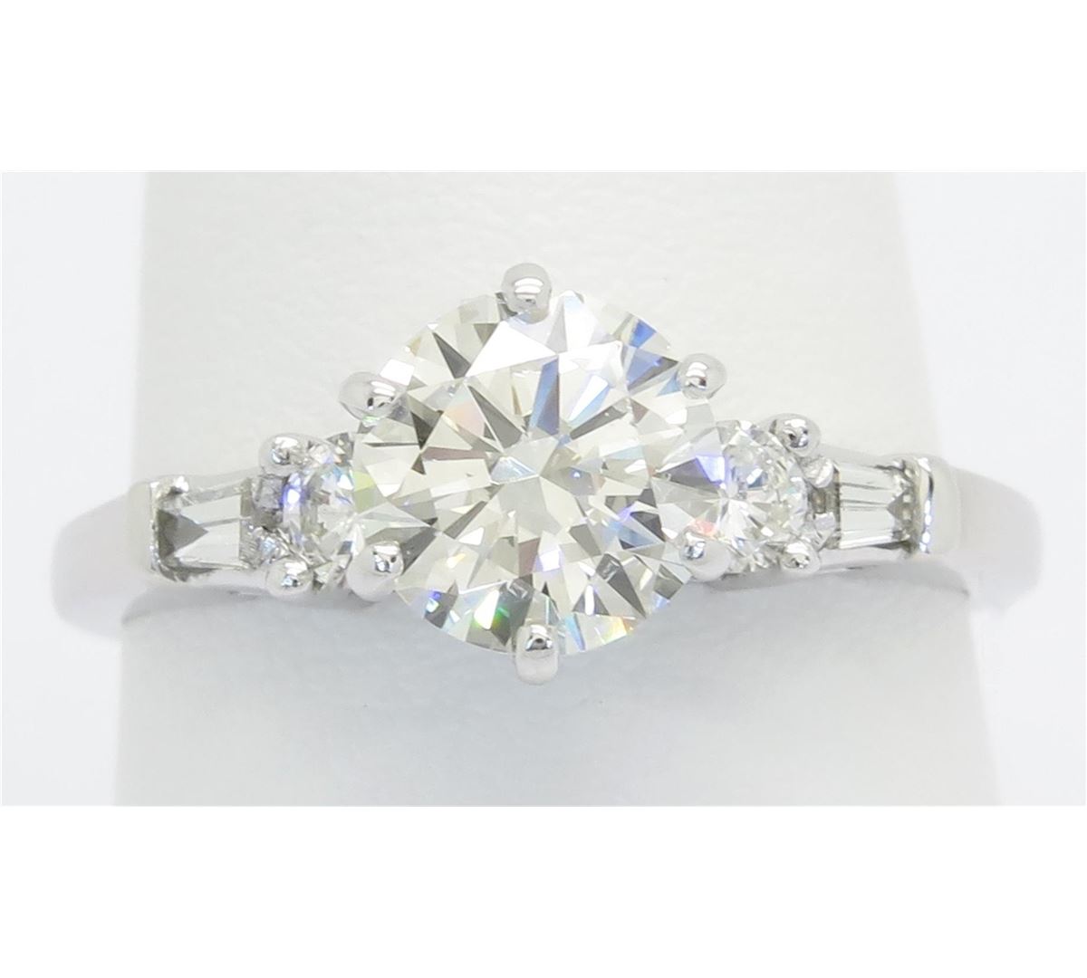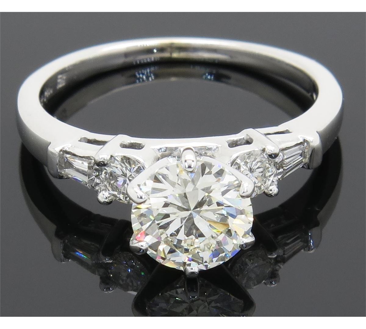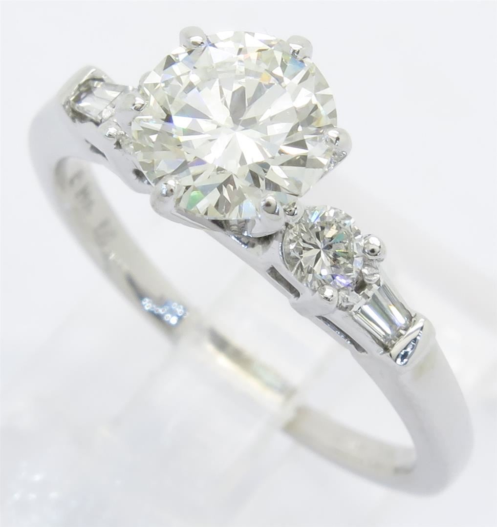 One tested 14K white gold diamond ring. Containing: One prong set EGL USA Certified Round Brilliant Cut Diamond, Size: 1.20CT, Clarity: SI1, Color: K. Two Round Brilliant Cut Diamonds, two Tapered Baguette Cut Diamonds. Total weight of 5 diamonds:1.50CTW. All diamonds are graded in the mounting unless otherwise stated. Weight of ring: 3.4 grams, Size: 6.25. EGL USA Appraised.