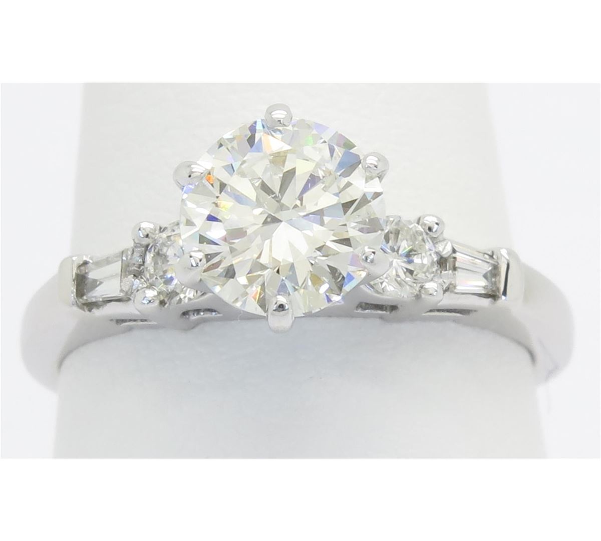 One tested 14K white gold diamond ring. Containing: One prong set EGL USA Certified Round Brilliant Cut Diamond, Size: 1.20CT, Clarity: SI1, Color: K. Two Round Brilliant Cut Diamonds, two Tapered Baguette Cut Diamonds. Total weight of 5 diamonds:1.50CTW. All diamonds are graded in the mounting unless otherwise stated. Weight of ring: 3.4 grams, Size: 6.25. EGL USA Appraised.