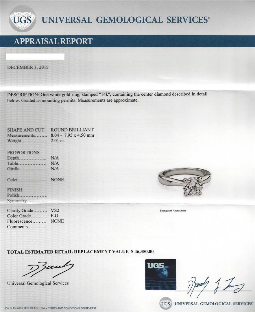 Up for auction is a beautiful EGL USA Certified 14KT white gold diamond solitaire ring! Stamped "14k", the ring contains a 2.01ct center diamond. Graded as mounting permits. Shape and Cut: Round brilliant. Measurements: 8.04 - 7.95 x 4.50mm. Culet: None. Clarity Grade: VS2. Color Grade: F-G. Fluorescence: None. Measurements are approximate. The ring weighs a total of 2.40 grams. UGS Appraised at $46,350.00.