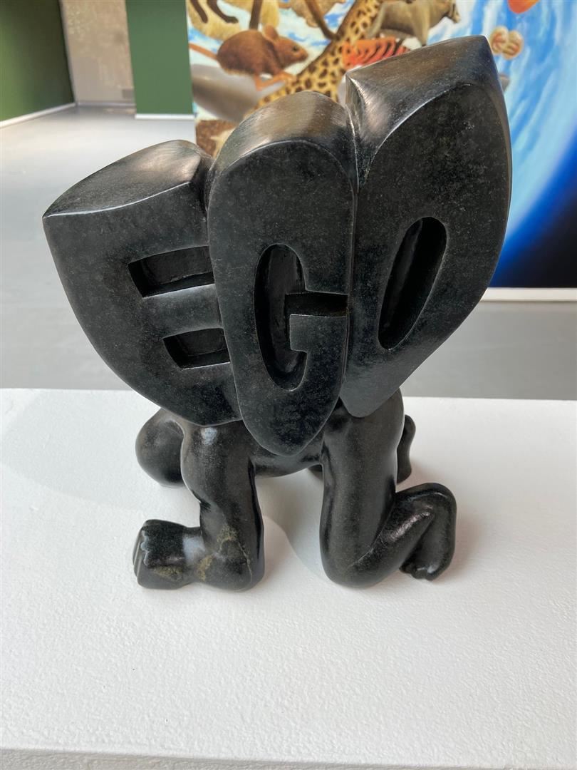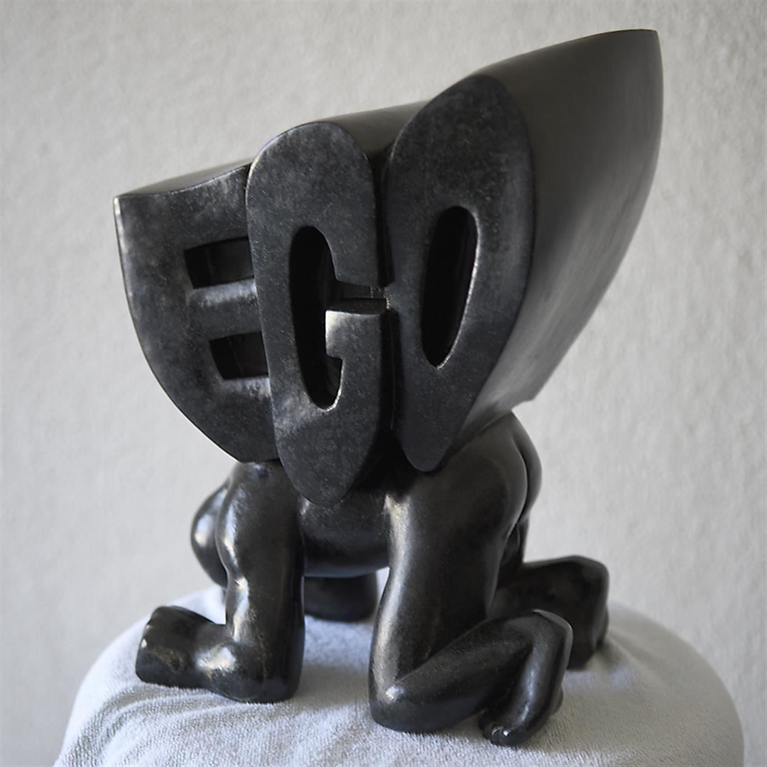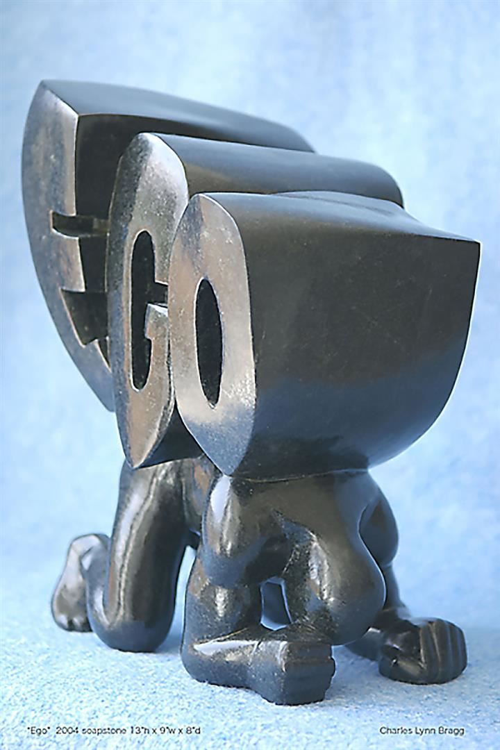 Soapstone sculpture by Charles Lynn Bragg. A man struggles with his big, heavy, awkward Ego. 13 x 9 x 8 Weighs 39.5lbs.