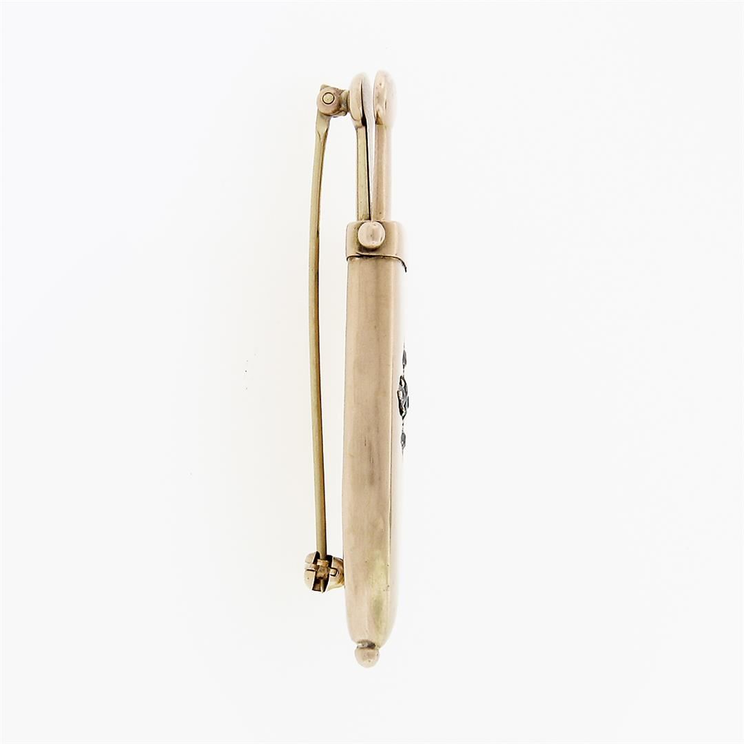 An antique solid 14k yellow gold cigar cutter pin brooch, with 1 emerald cut natural emerald (0.25ct), & 4 old mine cut natural diamonds (H/I- VS2; 0.28ctw). Measures 50.65x18.42mm and weighs a total of 14.02 grams.