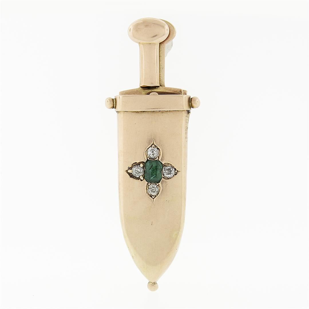 An antique solid 14k yellow gold cigar cutter pin brooch, with 1 emerald cut natural emerald (0.25ct), & 4 old mine cut natural diamonds (H/I- VS2; 0.28ctw). Measures 50.65x18.42mm and weighs a total of 14.02 grams.