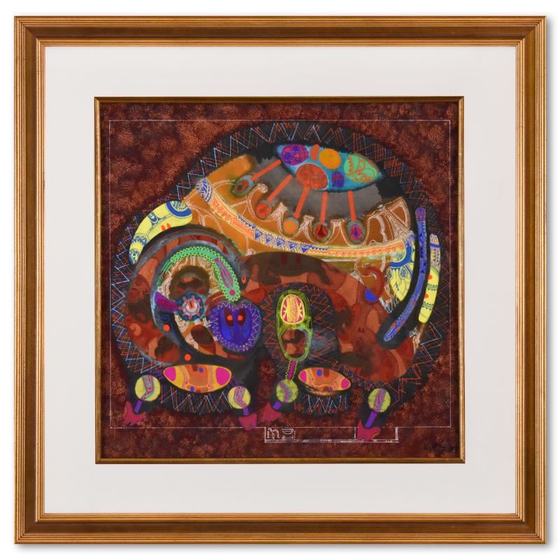 "Earth Pig (1997)" is an original mixed media painting on paper by Lu Hong, hand signed by the artist. This piece comes custom framed. Includes Letter of Authenticity. Measures approx. 28.5" x 28" (frame), 18.5" x 19" (image).