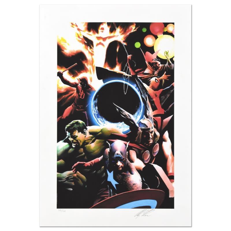 Alex Ross is acclaimed as one of the leading illustrators in comic art today. His realistic, human depictions of classic comic book characters for Marvel has cemented his position in the pantheon of comic book and contemporary pop culture illustrators. "Earth X" is a limited edition giclee on paper by Alex Ross and presented by Marvel Comics. This piece is numbered and hand signed by the artist. Includes Letter of Authenticity. Measures approx. 16.5" x 24" (border), 12.5" x 20" (image).