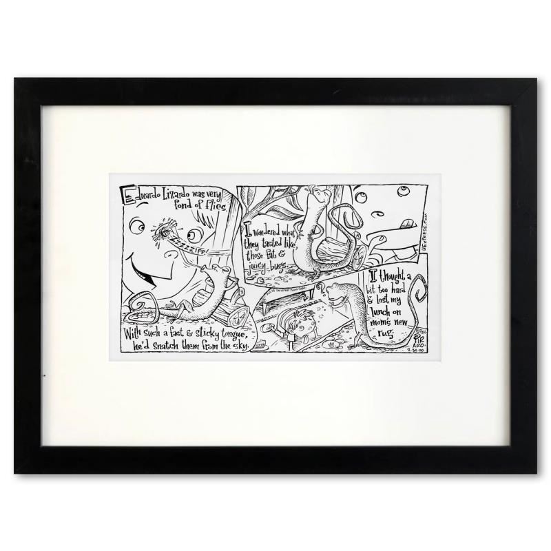 Enter a surreal and satirical world of twisted imagination and award winning creativity. "Eating Flies" is an original pen & ink drawing on paper by Dan Piraro, creator of the critically acclaimed and award winning comic strip, Bizarro. This piece is hand signed, comes custom framed and includes a letter of authenticity. Measures approximately 14" x 21" (frame), 7" x 13" (image).This item requires special handling and may have a longer than usual turnaround.