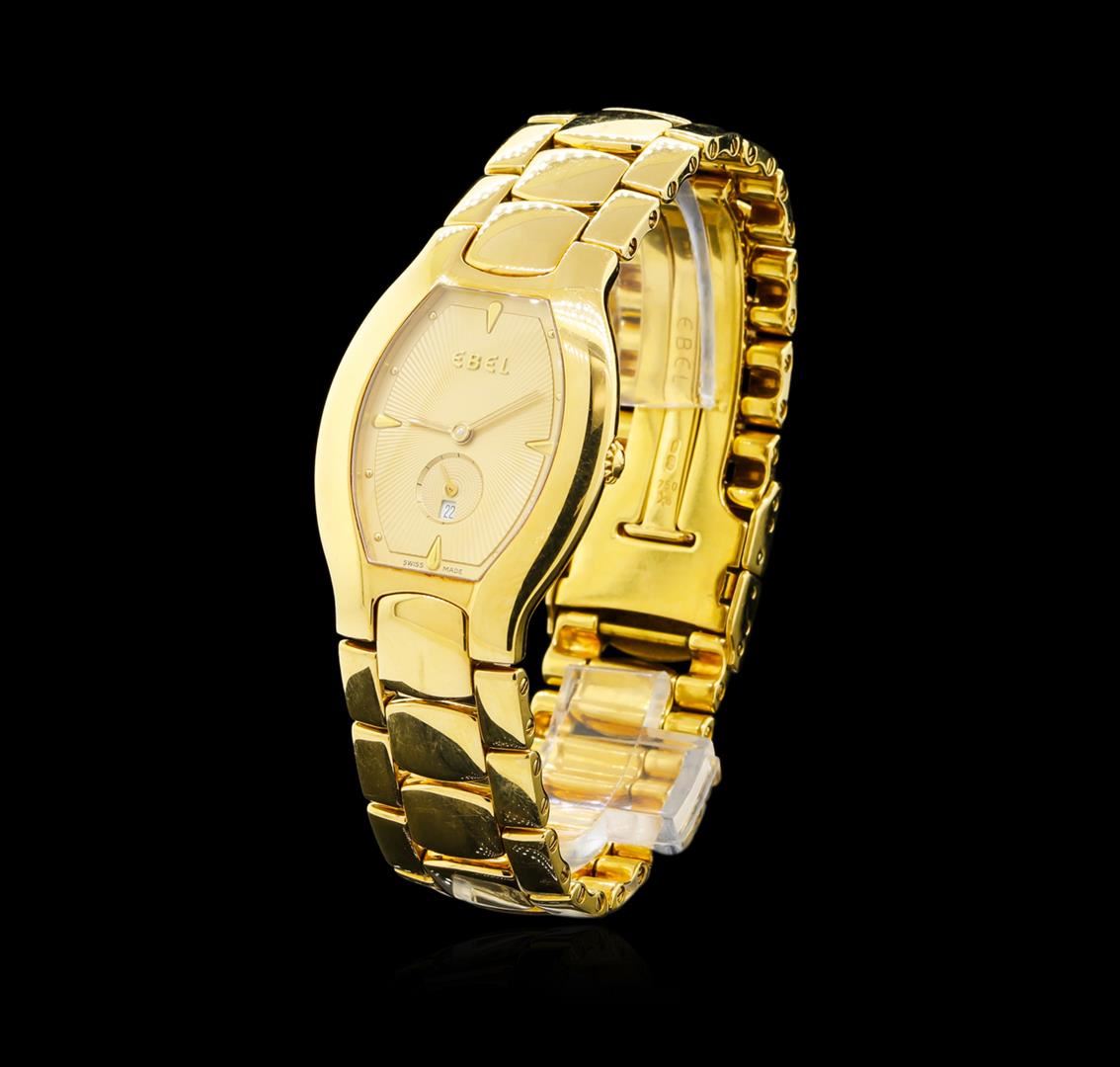 One Ebel Lichine Tonneau ladies watch featuring: Case: 18KT yellow gold. Bezel: 18KT yellow gold. Crystal: Scratch-resistant sapphire. Dial: Gold color, engraved and sunburst effect; gold tone hands; stick and dot index hour markers. Features: Date window located at the 6 o'clock position; small seconds window located at the 6 o'clock position. Bracelet: 18KT yellow gold. Condition: Minor surface scratches on case back, but otherwise there are no major signs of wear.