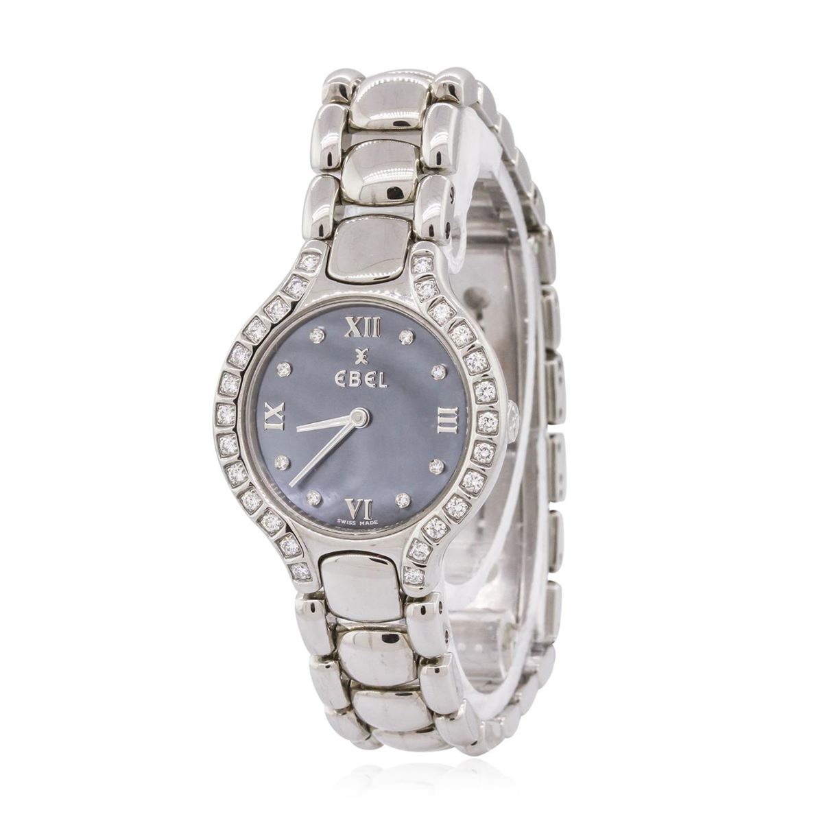 One Ebel Beluga wristwatch featuring: Swiss movement, Stainless Steel case, crown, lugs, and bracelet with deployment clasp, Diamond bezel, black mother of pearl dial with analog display, roman numerals, hour markers, hour and minute hands. This item measures 25mm across, including crown, and weighs a total of 44.00 grams.