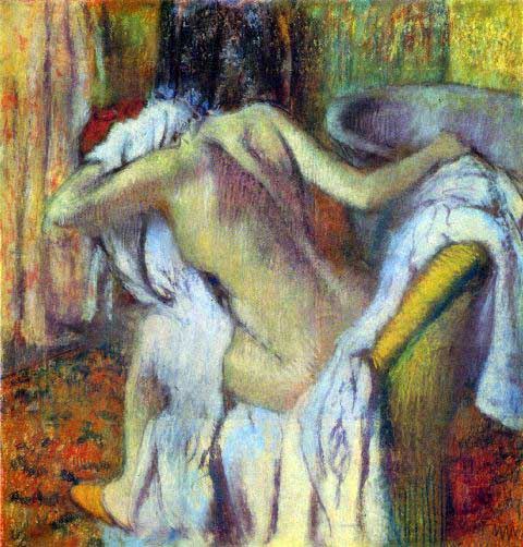 Artist: Degas - Title: After Bathing #4 - Medium: Fine Art Reproduction Giclee on Archival Canvas - Image Size: Approximately 20 inches x 19.25 inches - Framed: Unframed on Unstretched Canvas - Edgar Degas was a French artist famous for his work in painting, sculpture, printmaking and drawing. He is regarded as one of the founders of Impressionism although he rejected the term, and preferred to be called a realist. A superb draftsman, he is especially identified with the subject of the dance, and over half of his works depict dancers. These display his mastery in the depiction of movement, as do his racecourse subjects and female nudes. His portraits are notable for their psychological complexity and depiction of human isolation. - Early in his career, he wanted to be a history painter, a calling for which he was well prepared by his rigorous academic training and close study of classic art. In his early thirties, he changed course, and by bringing the traditional methods of a history painter to bear on contemporary subject matter, he became a classical painter of modern life.