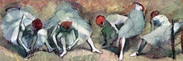 Artist: Degas - Title: Dancers Lace Their Shoes - Medium: Fine Art Reproduction Giclee on Archival Canvas - Image Size: Approximately 6.75 inches x 20 inches - Framed: Unframed on Unstretched Canvas - Edgar Degas was a French artist famous for his work in painting, sculpture, printmaking and drawing. He is regarded as one of the founders of Impressionism although he rejected the term, and preferred to be called a realist. A superb draftsman, he is especially identified with the subject of the dance, and over half of his works depict dancers. These display his mastery in the depiction of movement, as do his racecourse subjects and female nudes. His portraits are notable for their psychological complexity and depiction of human isolation. - Early in his career, he wanted to be a history painter, a calling for which he was well prepared by his rigorous academic training and close study of classic art. In his early thirties, he changed course, and by bringing the traditional methods of a history painter to bear on contemporary subject matter, he became a classical painter of modern life.
