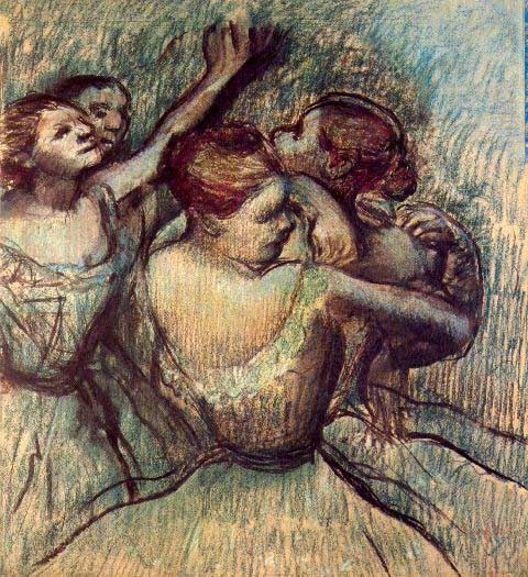 Artist: Degas - Title: Four Dancers In Half Figure - Medium: Fine Art Reproduction Giclee on Archival Canvas - Image Size: Approximately 20 inches x 18.25 inches - Framed: Unframed on Unstretched Canvas - Edgar Degas was a French artist famous for his work in painting, sculpture, printmaking and drawing. He is regarded as one of the founders of Impressionism although he rejected the term, and preferred to be called a realist. A superb draftsman, he is especially identified with the subject of the dance, and over half of his works depict dancers. These display his mastery in the depiction of movement, as do his racecourse subjects and female nudes. His portraits are notable for their psychological complexity and depiction of human isolation. - Early in his career, he wanted to be a history painter, a calling for which he was well prepared by his rigorous academic training and close study of classic art. In his early thirties, he changed course, and by bringing the traditional methods of a history painter to bear on contemporary subject matter, he became a classical painter of modern life.