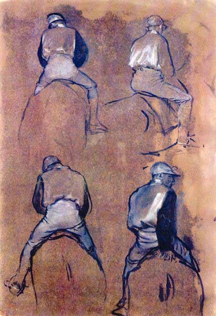 Artist: Degas - Title: Four Studies Of Jockeys - Medium: Fine Art Reproduction Giclee on Archival Canvas - Image Size: Approximately 20 inches x 13.75 inches - Framed: Unframed on Unstretched Canvas - Edgar Degas was a French artist famous for his work in painting, sculpture, printmaking and drawing. He is regarded as one of the founders of Impressionism although he rejected the term, and preferred to be called a realist. A superb draftsman, he is especially identified with the subject of the dance, and over half of his works depict dancers. These display his mastery in the depiction of movement, as do his racecourse subjects and female nudes. His portraits are notable for their psychological complexity and depiction of human isolation. - Early in his career, he wanted to be a history painter, a calling for which he was well prepared by his rigorous academic training and close study of classic art. In his early thirties, he changed course, and by bringing the traditional methods of a history painter to bear on contemporary subject matter, he became a classical painter of modern life.