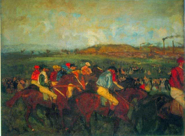 Artist: Degas - Title: Gentlemen's Race - Medium: Fine Art Reproduction Giclee on Archival Canvas - Image Size: Approximately 23.75 inches x 32 inches - Framed: Unframed on Unstretched Canvas - Edgar Degas was a French artist famous for his work in painting, sculpture, printmaking and drawing. He is regarded as one of the founders of Impressionism although he rejected the term, and preferred to be called a realist. A superb draftsman, he is especially identified with the subject of the dance, and over half of his works depict dancers. These display his mastery in the depiction of movement, as do his racecourse subjects and female nudes. His portraits are notable for their psychological complexity and depiction of human isolation. - Early in his career, he wanted to be a history painter, a calling for which he was well prepared by his rigorous academic training and close study of classic art. In his early thirties, he changed course, and by bringing the traditional methods of a history painter to bear on contemporary subject matter, he became a classical painter of modern life.