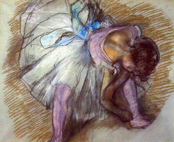 Artist: Degas - Title: Sitting Dancer Lacing Her Slipper - Medium: Fine Art Reproduction Giclee on Archival Canvas - Image Size: Approximately 16.25 inches x 20 inches - Framed: Unframed on Unstretched Canvas - Edgar Degas was a French artist famous for his work in painting, sculpture, printmaking and drawing. He is regarded as one of the founders of Impressionism although he rejected the term, and preferred to be called a realist. A superb draftsman, he is especially identified with the subject of the dance, and over half of his works depict dancers. These display his mastery in the depiction of movement, as do his racecourse subjects and female nudes. His portraits are notable for their psychological complexity and depiction of human isolation. - Early in his career, he wanted to be a history painter, a calling for which he was well prepared by his rigorous academic training and close study of classic art. In his early thirties, he changed course, and by bringing the traditional methods of a history painter to bear on contemporary subject matter, he became a classical painter of modern life.