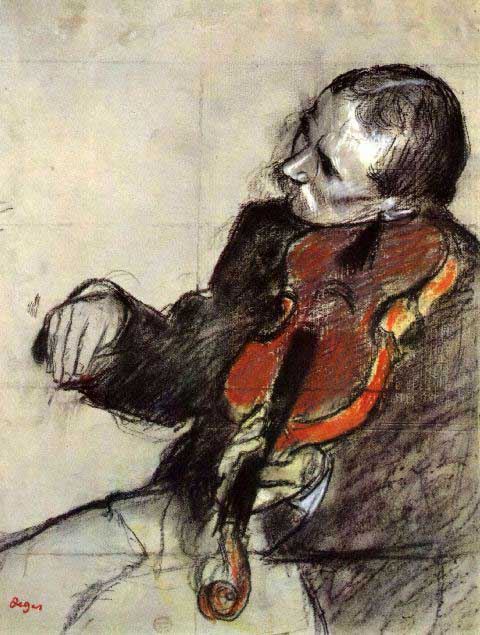 Artist: Degas - Title: Study Of Violinist - Medium: Fine Art Reproduction Giclee on Archival Canvas - Image Size: Approximately 20 inches x 15 inches - Framed: Unframed on Unstretched Canvas - Edgar Degas was a French artist famous for his work in painting, sculpture, printmaking and drawing. He is regarded as one of the founders of Impressionism although he rejected the term, and preferred to be called a realist. A superb draftsman, he is especially identified with the subject of the dance, and over half of his works depict dancers. These display his mastery in the depiction of movement, as do his racecourse subjects and female nudes. His portraits are notable for their psychological complexity and depiction of human isolation. - Early in his career, he wanted to be a history painter, a calling for which he was well prepared by his rigorous academic training and close study of classic art. In his early thirties, he changed course, and by bringing the traditional methods of a history painter to bear on contemporary subject matter, he became a classical painter of modern life.
