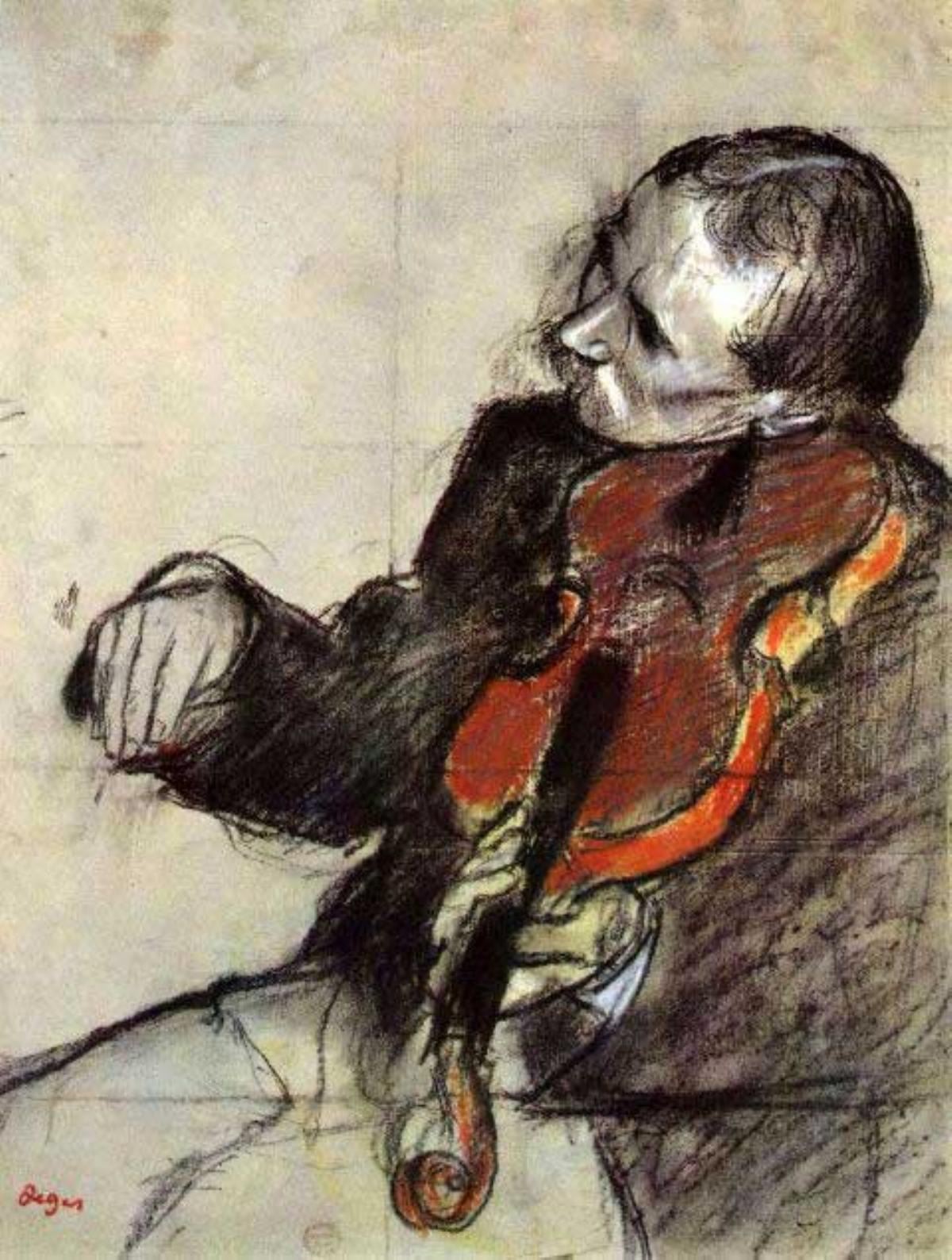 Artist: Degas - Title: Study Of Violinist - Medium: Fine Art Reproduction Giclee on Archival Canvas - Image Size: Approximately 32 inches x 24.25 inches - Framed: Unframed on Unstretched Canvas - Edgar Degas was a French artist famous for his work in painting, sculpture, printmaking and drawing. He is regarded as one of the founders of Impressionism although he rejected the term, and preferred to be called a realist. A superb draftsman, he is especially identified with the subject of the dance, and over half of his works depict dancers. These display his mastery in the depiction of movement, as do his racecourse subjects and female nudes. His portraits are notable for their psychological complexity and depiction of human isolation. - Early in his career, he wanted to be a history painter, a calling for which he was well prepared by his rigorous academic training and close study of classic art. In his early thirties, he changed course, and by bringing the traditional methods of a history painter to bear on contemporary subject matter, he became a classical painter of modern life.